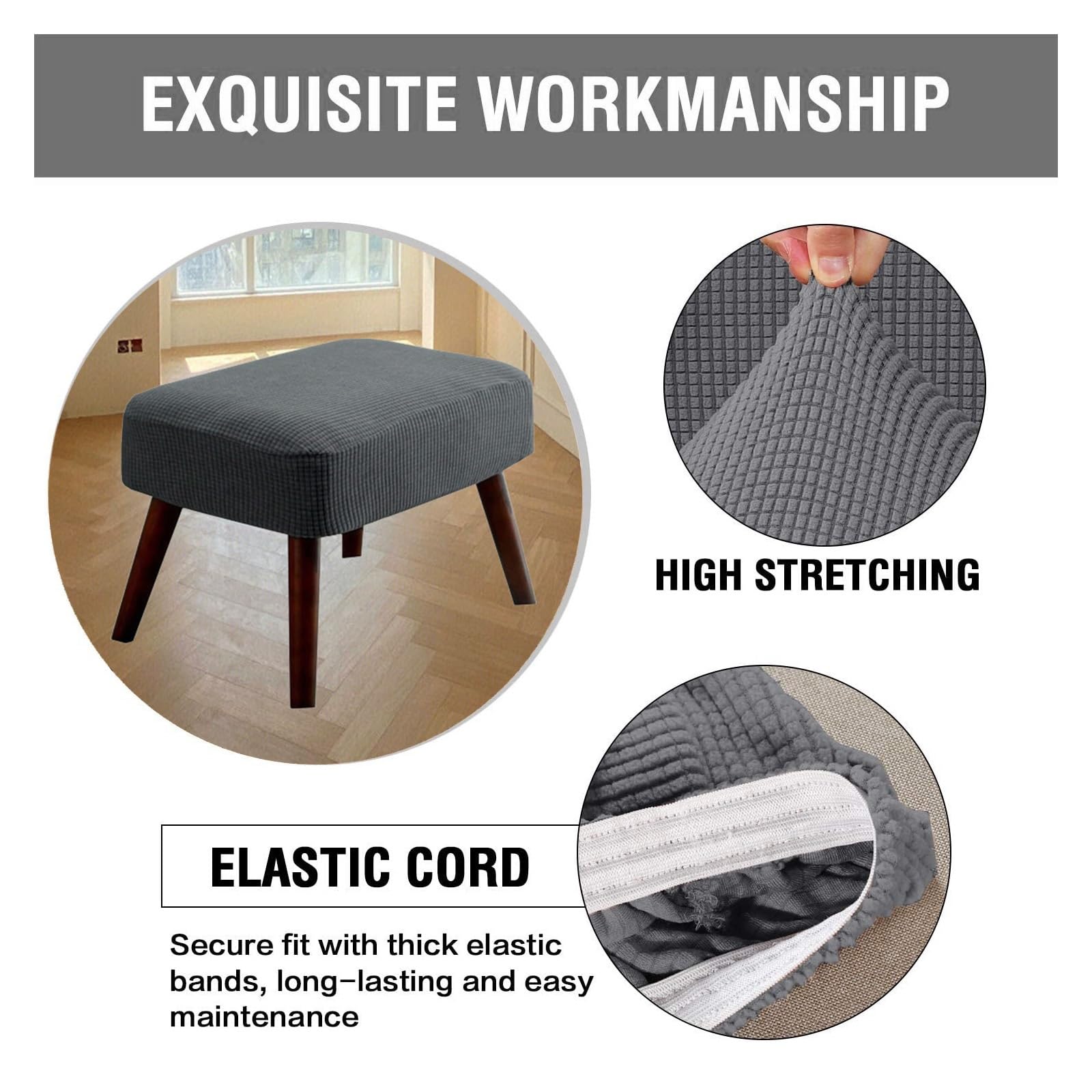 Oh, dieser Ottomanen-Bezug ist ja mal die perfekte Lösung für alle, die ihren Hocker schützen wollen! Aus weichem Polyester-Jacquard-Stoff - fühlt sich gut an und sieht total edel aus. In Weiß passt er zu jedem Wohnzimmer.\n\nDie elastische Unterseite ist genial: Der Bezug sitzt wie angegossen und verrutscht nicht. Egal ob deine Ottomane 34cm oder 45cm misst - dieser Bezug passt sich perfekt an. Einfach überziehen und die elastische Kante sorgt für straffen Sitz.\n\nTotaler Schutz für deine Möbel: Vor verschütteten Getränken, Schuhabdrücken, Haustierkrallen... einfach allem, was deine Ottomane kaputt machen könnte. Besonders praktisch wenn Kinder oder Haustiere im Haus sind!\n\nFür Stoff- und Ledermöbel geeignet - eine echte Allround-Lösung. Und wenn er mal dreckig ist, einfach abziehen und waschen. So bleiben deine Möbel ewig wie neu!\n\nMontage ist kinderleicht: Einfach die vier Ecken finden, aufziehen und glatt streichen. Kein Nähen, kein Kleben - in 30 Sekunden ist der Hocker geschützt.\n\nDas Jacquard-Muster sieht richtig hochwertig aus - nicht so billig wie manche Schonbezüge. Und die Knitterfestigkeit sorgt dafür, dass es immer ordentlich aussieht.\n\nEinfach mal ausprobieren und deine Möbel investition schützen! Ob für teures Designermöbel oder den geliebten Familien-Hocker - dieser Bezug hält alles schön und sauber.