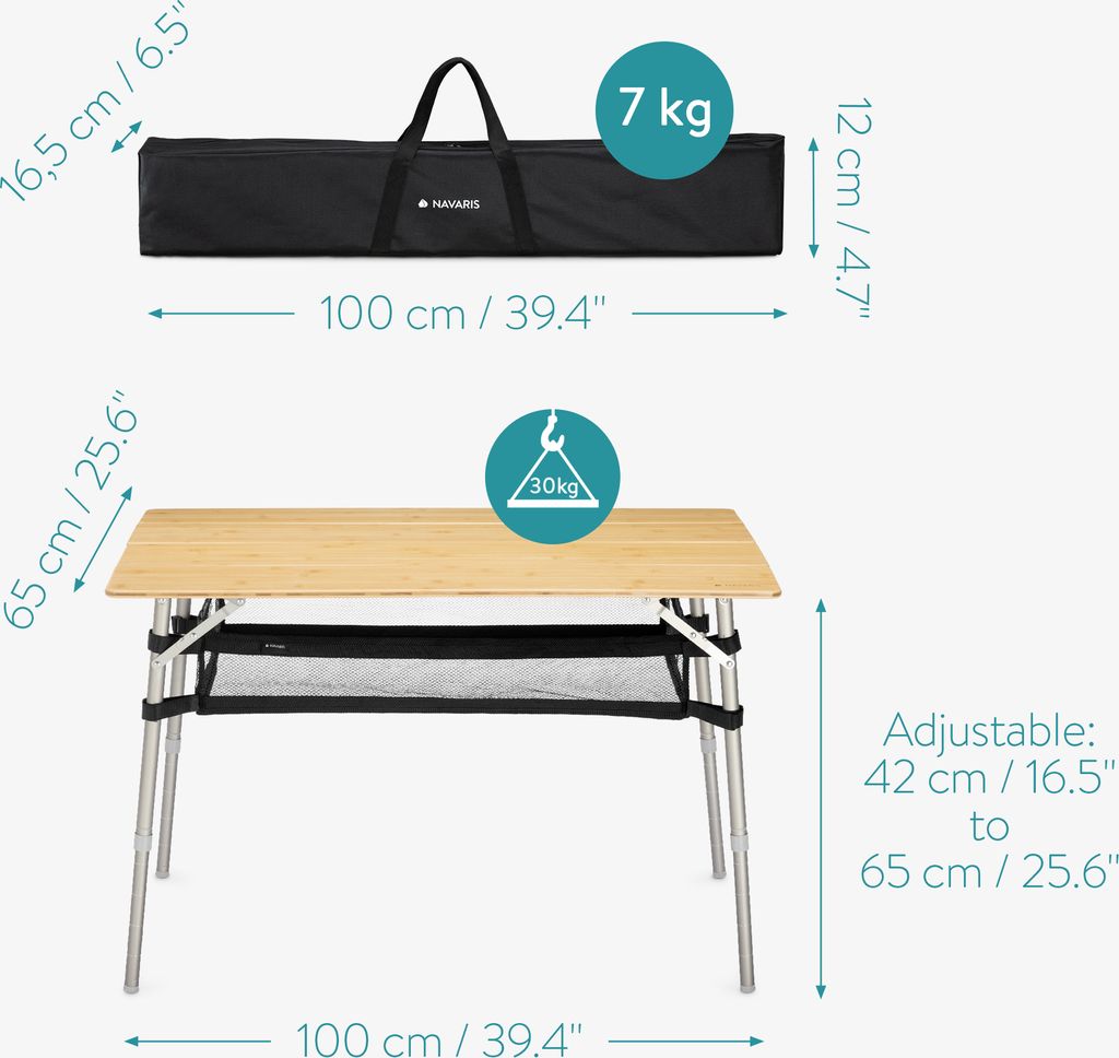 Boah, was für ein praktischer Tisch! Aus nachhaltigem Bambus, komplett klappbar und dazu noch wetterfest - was will man mehr? Ob beim Camping, Grillen oder im Garten - dieser Tisch ist immer dabei. Und mit den höhenverstellbaren Beinen (52cm oder 65cm) steht er auf jedem Untergrund stabil. 🌿\\n\\nSuper clever: Die Netzablage unter der Platte - da kannst du Besteck, Snacks oder Werkzeug verstauen. Und wenn du ihn nicht brauchst, klappst du ihn einfach zusammen - dann ist er nur noch 12cm dick! Es gibt drei Größen zur Auswahl.\\n\\nAlle Features:\\n• Aus nachhaltigem Bambus-Holz\\n• Wetterfeste Oberfläche\\n• Höhenverstellbar: 52cm/65cm\\n• Mit praktischer Netzablage\\n• Einfach zusammenzuklappen\\n• Drei Größen verfügbar