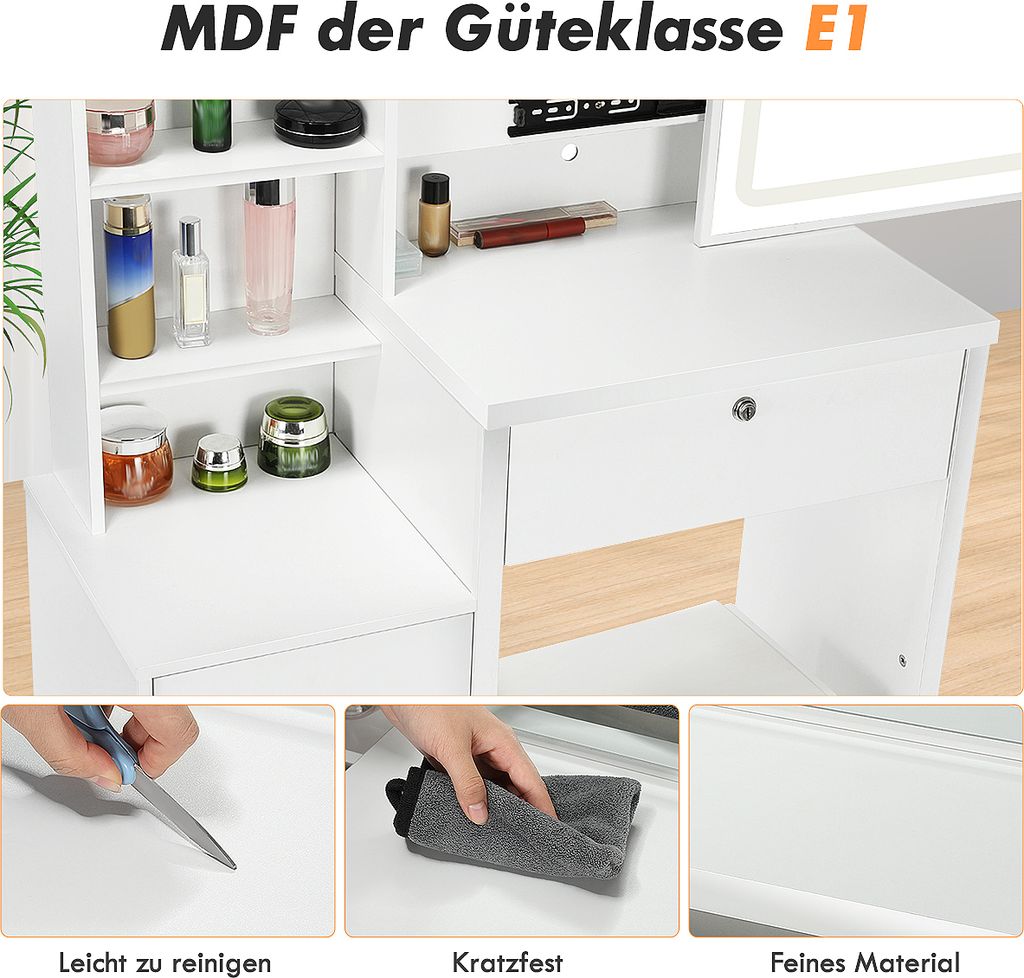 Der große LED-Spiegel (60x45,5cm) hat 12 Leuchten mit 3 Farbtemperaturen und dimmbarer Helligkeit - perfektes Licht für makelloses Make-up zu jeder Tageszeit. 4 offene Fächer und 3 Schubladen organisieren alles übersichtlich.