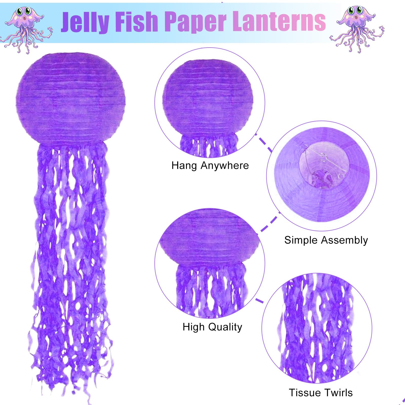 Tauch ein in eine Unterwasserwelt! Diese 6 wunderschönen Quallen-Papierlaternen verwandeln jeden Raum in ein ozeanisches Paradies. In zarten Farbtönen von Hellrosa, Hellviolett und Hellblau schweben sie wie echte Quallen an der Decke. Mit ca. 25 cm Durchmesser und 55 cm langen Quasten sind sie ein echter Hingucker. Einfach den Metallrahmen einsetzen und mit dem beigefügten Haken aufhängen - fertig ist die magische Unterwasser-Atmosphäre! Perfekt für Meerjungfrauen-Partys, Kindergeburtstage, Babypartys oder jede Feier mit Meeres-Thema. Nach der Party klappst du sie einfach zusammen und bewahrst sie für den nächsten Einsatz auf. Die hochwertigen Papierlaternen sind umweltfreundlich und unbedenklich für Kinder. Sie bringen nicht nur Farbe in deine Party, sondern zaubern auch strahlende Gesichter bei allen Gästen!