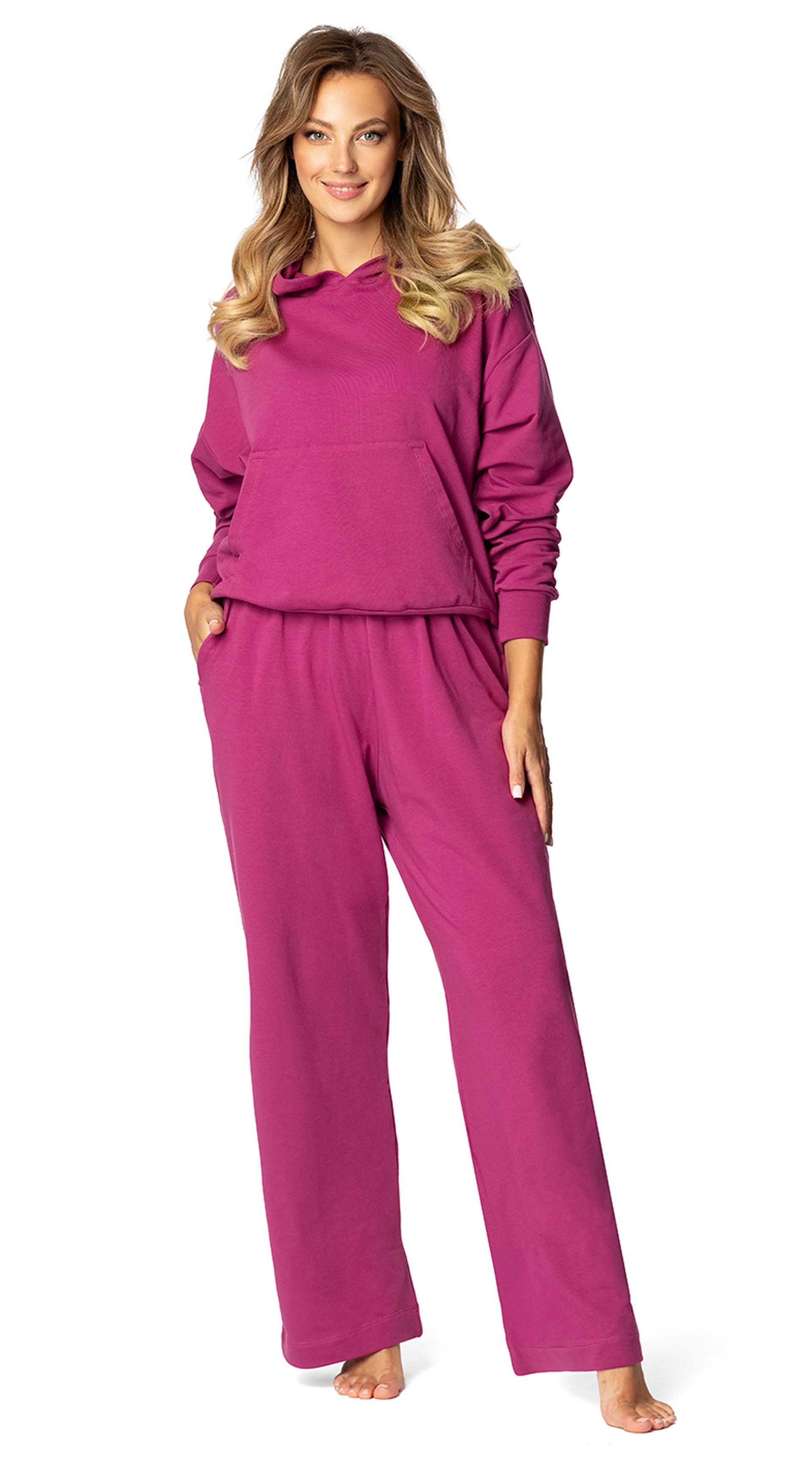 Ultimative Comfortwear für entspannte Tage! Dieser Jogginganzug von THE PEOPLE REP. kombiniert lässigen Style mit super Tragekomfort. Der Kapuzenpullover mit Reißverschluss und die weit geschnittene Hose sehen nicht nur gut aus, sondern fühlen sich auch noch himmlisch weich an.\\n\\nPerfekt für gemütliche Tage zu Hause, zum Einkaufen oder für sportliche Aktivitäten. Die Mischung aus Polyester, Lyocell und Elasthan macht das Material angenehm dehnbar und atmungsaktiv. Dank der praktischen Fronttaschen am Hoodie hast du immer Platz für Handy und Schlüssel.\\n\\n• Material: 74% Polyester, 21% Lyocell, 5% Elasthan\\n• Farben: Flieder, Hellblau, Dunkelblau\\n• Features: Weite Passform, Kapuze, Fronttaschen\\n• Pflege: Maschinenwäsche 30°C\\n• Stil: Lässig, femininer Schnitt\\n\\nEgal ob zum Sporteln, Chillen oder für unterwegs - mit diesem Set bist du immer perfekt angezogen und fühlst dich rundum wohl in deiner Haut!