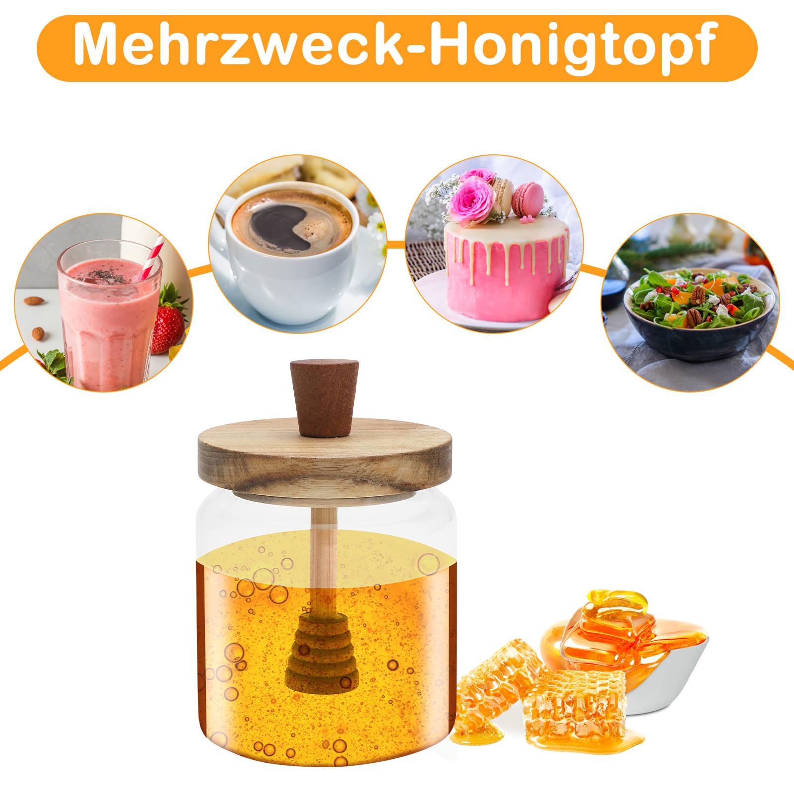 Perfekte Honiggläser für deine Küche! Dieses Set mit zwei 400ml Spender-Gläsern ist ideal für Honig, Marmelade oder Sirup. Aus hochwertigem Borosilikatglas und mit massivem Holzdeckel - sieht nicht nur gut aus, sondern ist auch super praktisch!