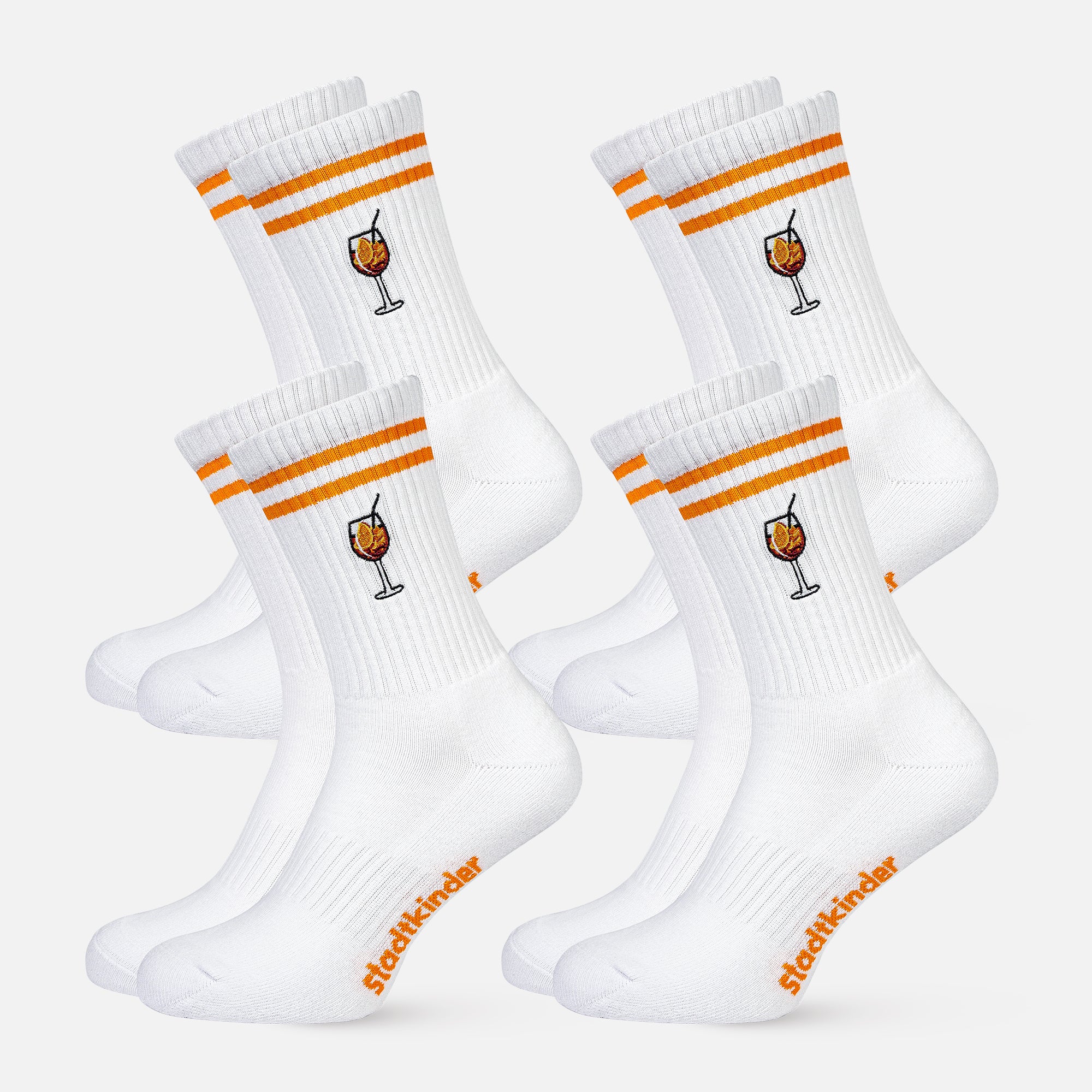 Prost mit den Füßen! Diese ultra-lustigen Aperol Socken sind das perfekte Geschenk für alle Aperol Spritz Liebhaber. Im 3er-Pack mit weißen Tennissocken, verziert mit süßen Weinglas-Stickereien und bunten Streifen. Aus weicher Baumwolle - angenehm zu tragen und atmungsaktiv. Passen für Damen und Herren in Größe 36-40. Super für Partys, als Urlaubs-Erinnerung oder einfach für alle, die Italien-Feeling lieben. Die Farben bleiben auch nach dem Waschen schön kräftig. Ein echter Hingucker - ob unter der Jeans oder mit Shorts. Bringt immer ein Lächeln ins Gesicht! Auch ein super Geschenk für Geburtstage oder als Mitbringsel. Einfach anziehen und Aperol-Stimmung verbreiten!