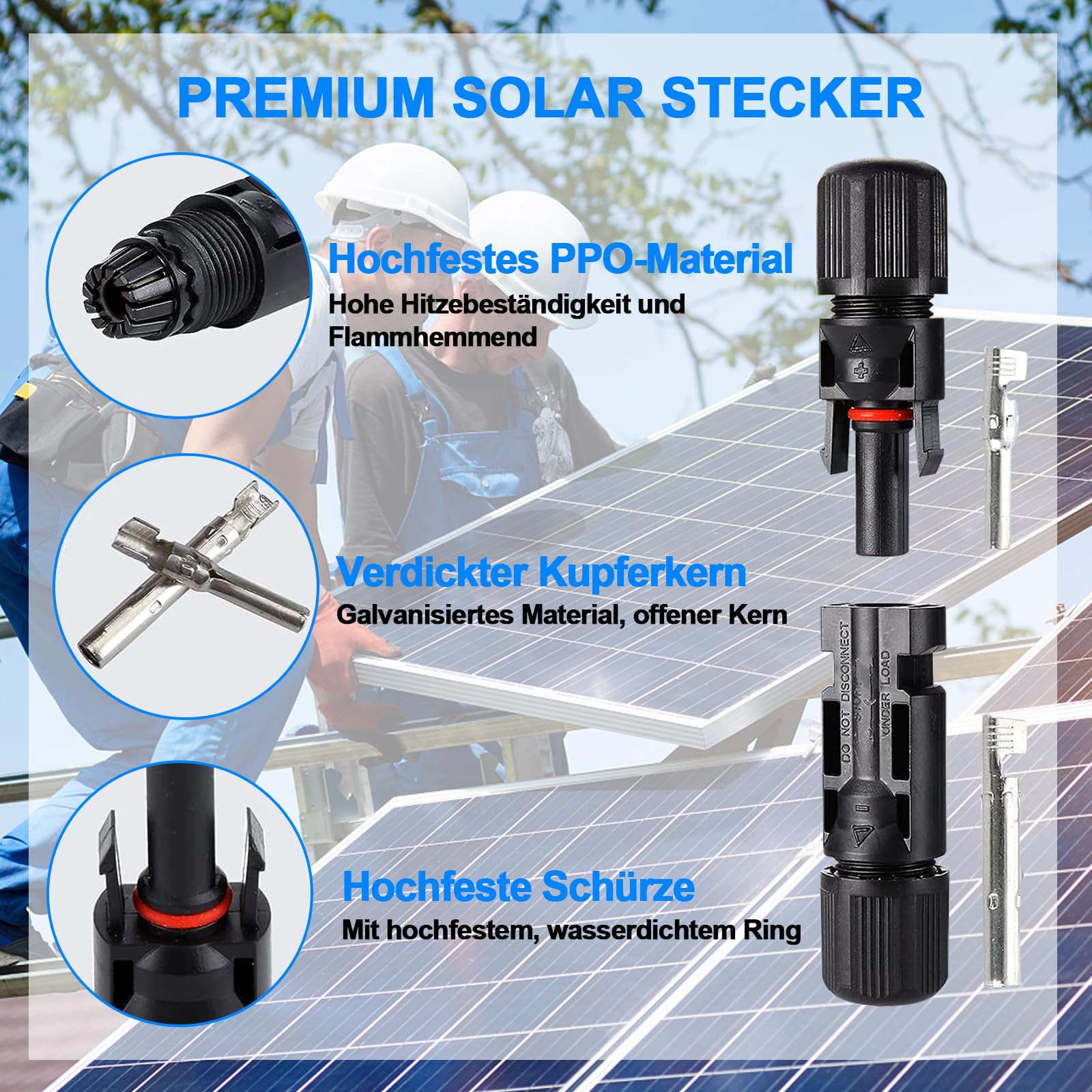 Hey, für alle Solar-Bastler und Profis! Diese 20 Paar Solarstecker sind einfach genial für eure Photovoltaik-Projekte. Mit IP67-Zertifizierung sind die Dinger absolut wasser- und staubdicht - da kann auch mal ein Regenschauer kommen, kein Problem!\n\nDie Stecker passen für Kabel mit 2,5mm², 4mm² und 6mm² Querschnitt und sind komplett kompatibel mit MC4-Steckern. Das bedeutet, ihr könnt sie mit fast allen gängigen Solarpanels und Komponenten verwenden. Super praktisch, oder?\n\nWas ich besonders cool finde: Der versilberte Kupferkern sorgt für optimale Leitfähigkeit und die PPO-Isolierung ist nicht nur flammhemmend, sondern hält auch Temperaturen von -40°C bis +125°C stand. Egal ob eiskalter Winter oder heißer Sommer - die Stecker machen einfach immer ihren Job.\n\nMontage? Total easy! Im Lieferumfang ist ein Multifunktionsschlüssel dabei, mit dem ihr die Stecker ganz einfach zusammenbauen und wieder auseinandernehmen könnt. Ohne dass was kaputt geht, versteht sich.\n\nTechnische Daten im Überblick:\n- Nennspannung: 1000V DC\n- Stromstärke: bis 30A\n- Prüfspannung: 6000V DC\n- Schutzart: IP67\n- Betriebstemperatur: -40°C bis +125°C\n\nPerfekt für:\n- Dach-Solaranlagen\n- Garten-Solarprojekte\n- Camping-Ausbau\n- Gewerbliche PV-Anlagen\n\nOb drinnen oder draußen - mit diesen Steckern seid ihr auf der sicheren Seite. Und mit 20 Paar habt ihr auch genug Vorrat für mehrere Projekte!
