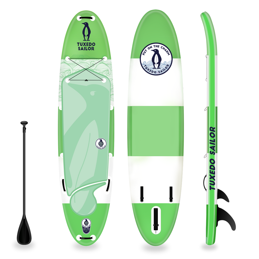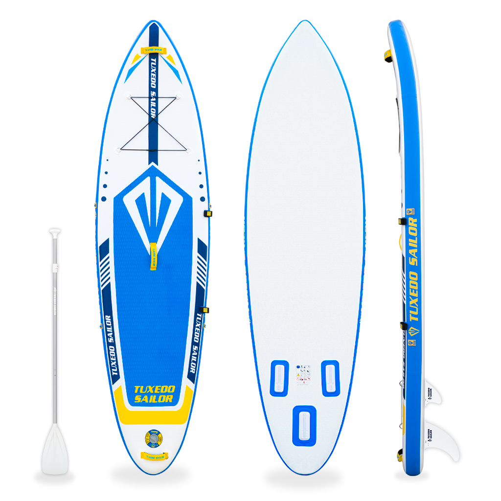 Ab aufs Wasser! Das Tuxedo Sailor SUP Board ist dein Ticket zu unvergesslichen Wasserabenteuern.\n\nBoard-Daten:\n• Länge: 320cm (10'6\)\n• Breite: 84cm (33\)\n• Dicke: 15cm (6\)\n• Max. Belastung: 150kg\n• Material: Doppellagiges PVC\n\nHigh-Tech Features:\n• Militärqualität PVC\n• Dropstitch-Technologie\n• Thermisches Klebeverfahren\n• Rutschfeste Deckpads\n• Verstärkte Kopf- und Heckpartien\n\nVorteile:\n• Extrem stabil - perfekt für Anfänger\n• Leicht zu transportieren\n• Schnell auf- und abzupumpen\n• Robust und langlebig\n• Für Yoga, Angeln, Surfen\n\nIm Lieferumfang:\n• Aufblasbares SUP Board\n• Paddel\n• Pumpe\n• Tasche\n• Sicherheitsleine\n\nEgal ob auf dem See, Meer oder Fluss - mit dem Tuxedo Sailor entdeckst du die Welt vom Wasser aus!