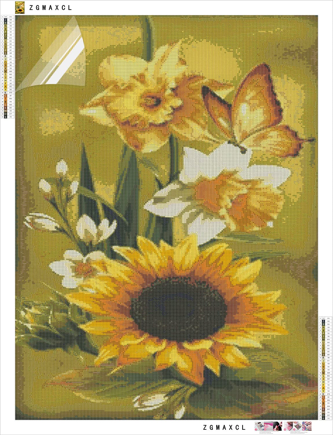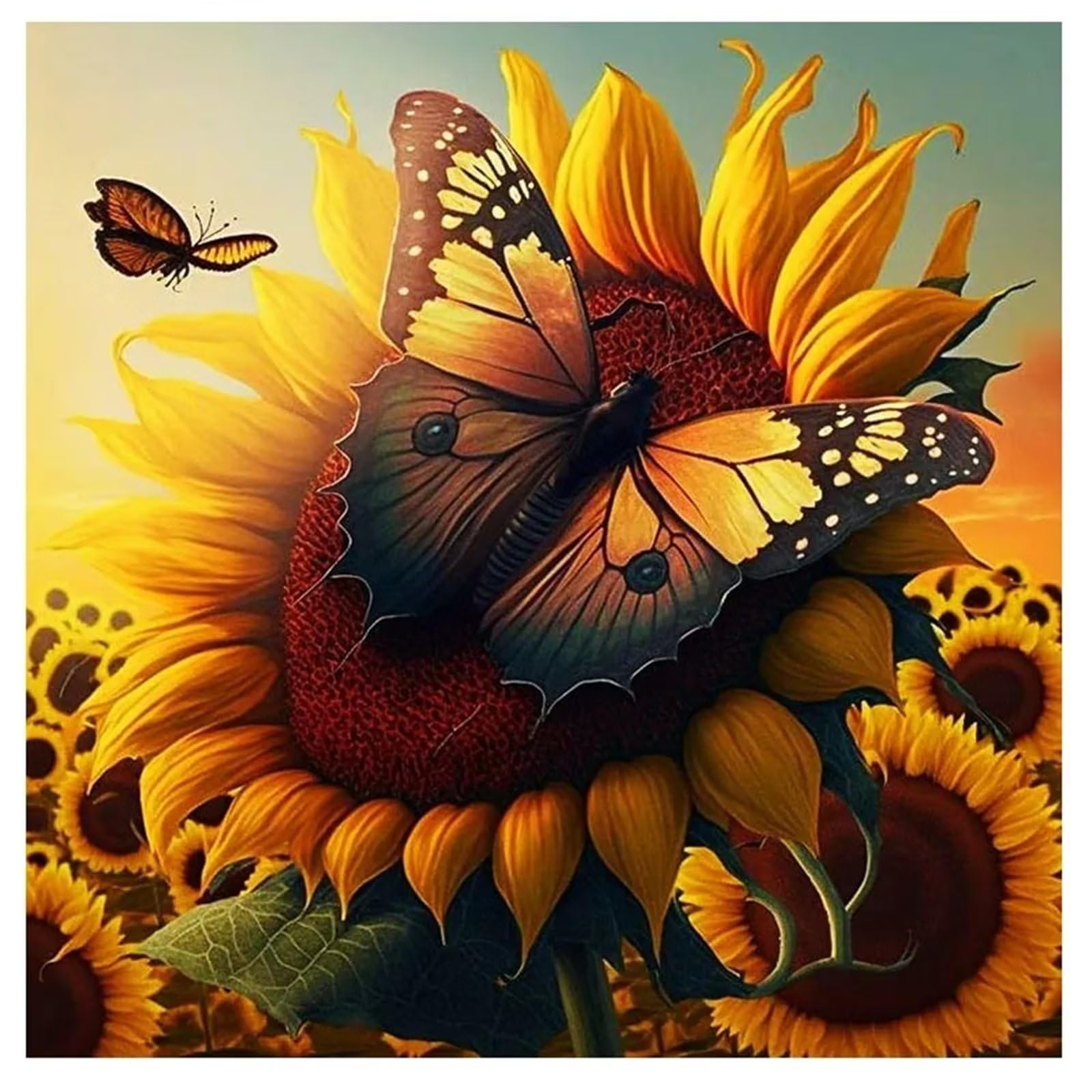 Entdecke die entspannende Welt des Diamond Paintings! Dieses wunderschöne Sonnenblumen-Motiv mit Schmetterlingen bringt Farbe und Glanz in dein Zuhause.