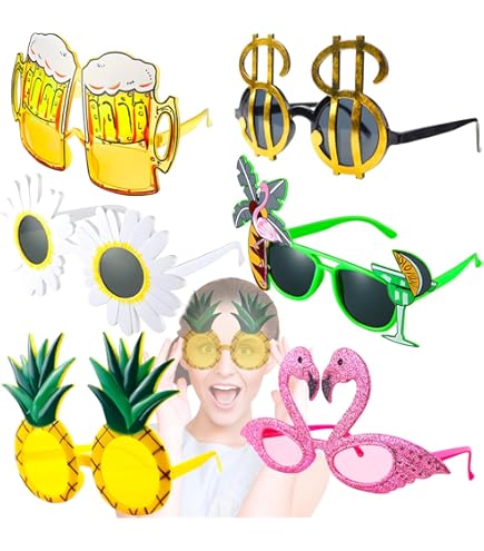 Bring Hawaii-Feeling auf deine nächste Party! Dieses 8-teilige Set mit lustigen Tropen-Brillen sorgt für garantiert gute Laune. Enthalten sind verschiedene Motive: gelbe Ananas, weiße Gänseblümchen, Bier, Palme, Flamingo, Muschel, Krabbe und Cocktailbecher. Aus hochwertigem Kunststoff gefertigt, sind die Brillen leicht, stabil und perfekt für Kinder und Erwachsene geeignet. Ideal für Hawaii-Partys, Luau-Feiern, Strandpartys, Geburtstage oder Sommerfeste. Als Foto-Requisiten sorgen sie für witzige Erinnerungsfotos mit Freunden und Familie. Einfach aufsetzen und schon bist du der Star der Party! Die bunten Designs verleihen jedem Outfit eine tropische Note. Perfekt als Geschenk, Party-Mitgebsel oder für die eigene Kostümsammlung. Mach deine Feier zu einem unvergesslichen Event mit diesen coolen Party-Brillen!