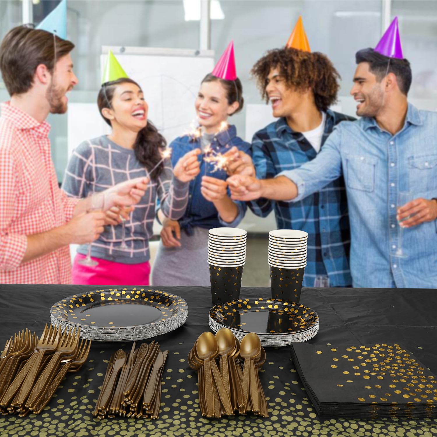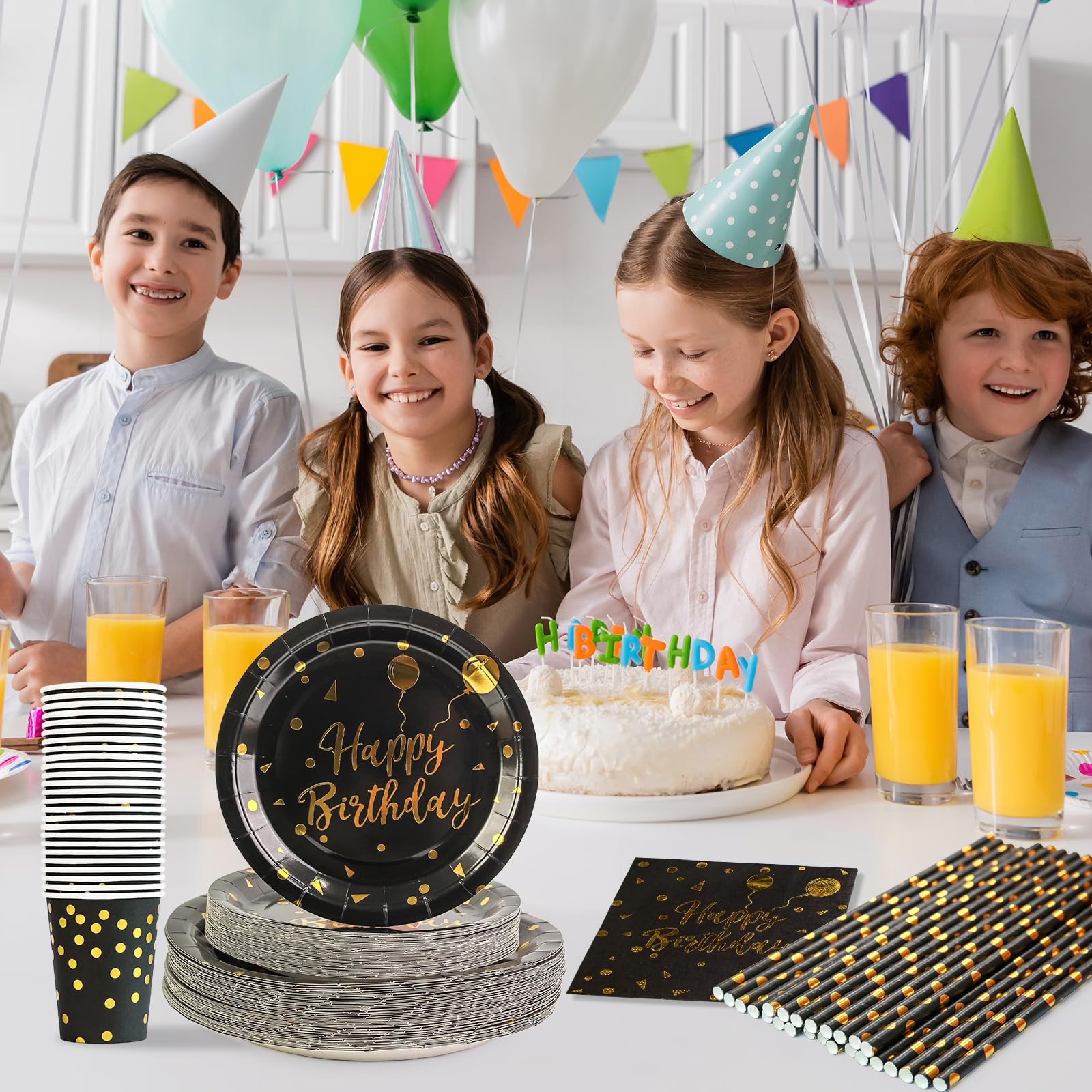 Happy Birthday Partygeschirr Set Schwarz Gold - Für 25 Gäste Komplett