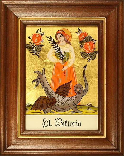 Wow, dieses Hinterglasbild von der heiligen Katrin ist einfach ein echter Hingucker! Jedes Bild wird liebevoll von Hand bemalt und wirkt durch die spezielle Glastechnik richtig lebendig - je nachdem, aus welchem Winkel du es betrachtest. Der Hintergrund ist mit echtem 24 Karat Blattgold veredelt, was dem Ganzen eine ganz besondere Ausstrahlung verleiht. Der braun gebeizte Holzrahmen rundet das klassische Erscheinungsbild perfekt ab.