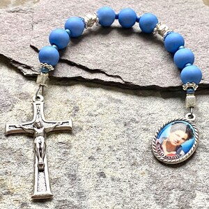 Die 10 Perlen mit je 8mm Durchmesser liegen angenehm in der Hand. Der helle beige Faden verbindet sie zu einem harmonischen Ganzen mit einem Umfang von 10cm. Besonders schön: die 1,5cm große Medaille mit dem eingravierten Gesicht von Carlo Acutis.