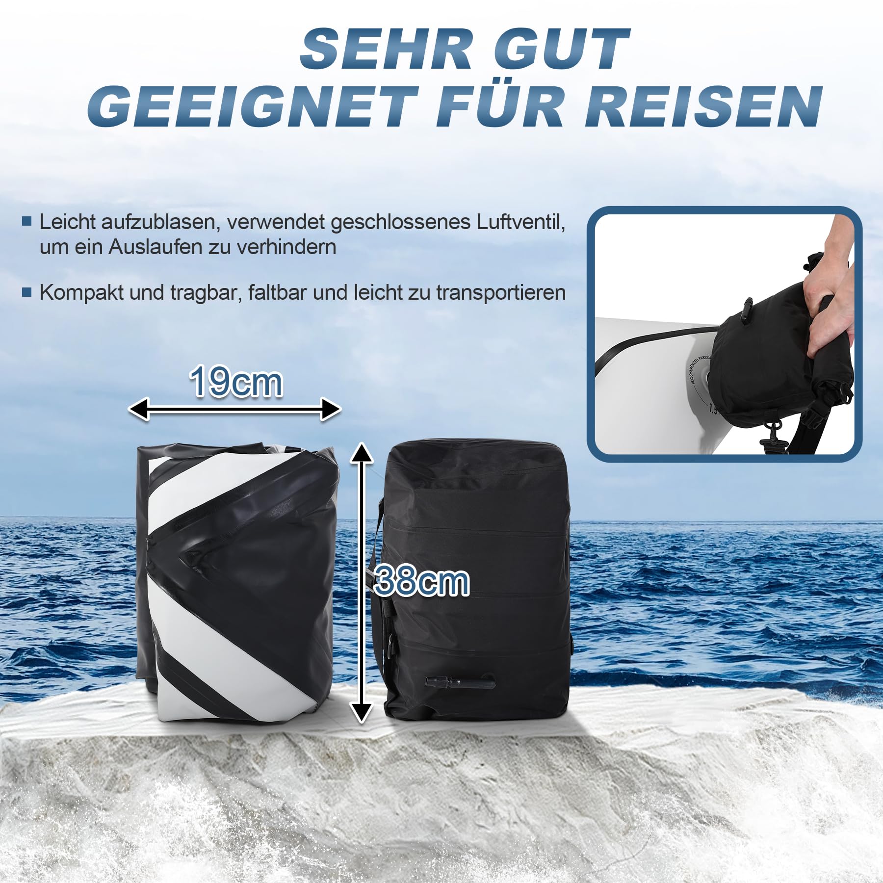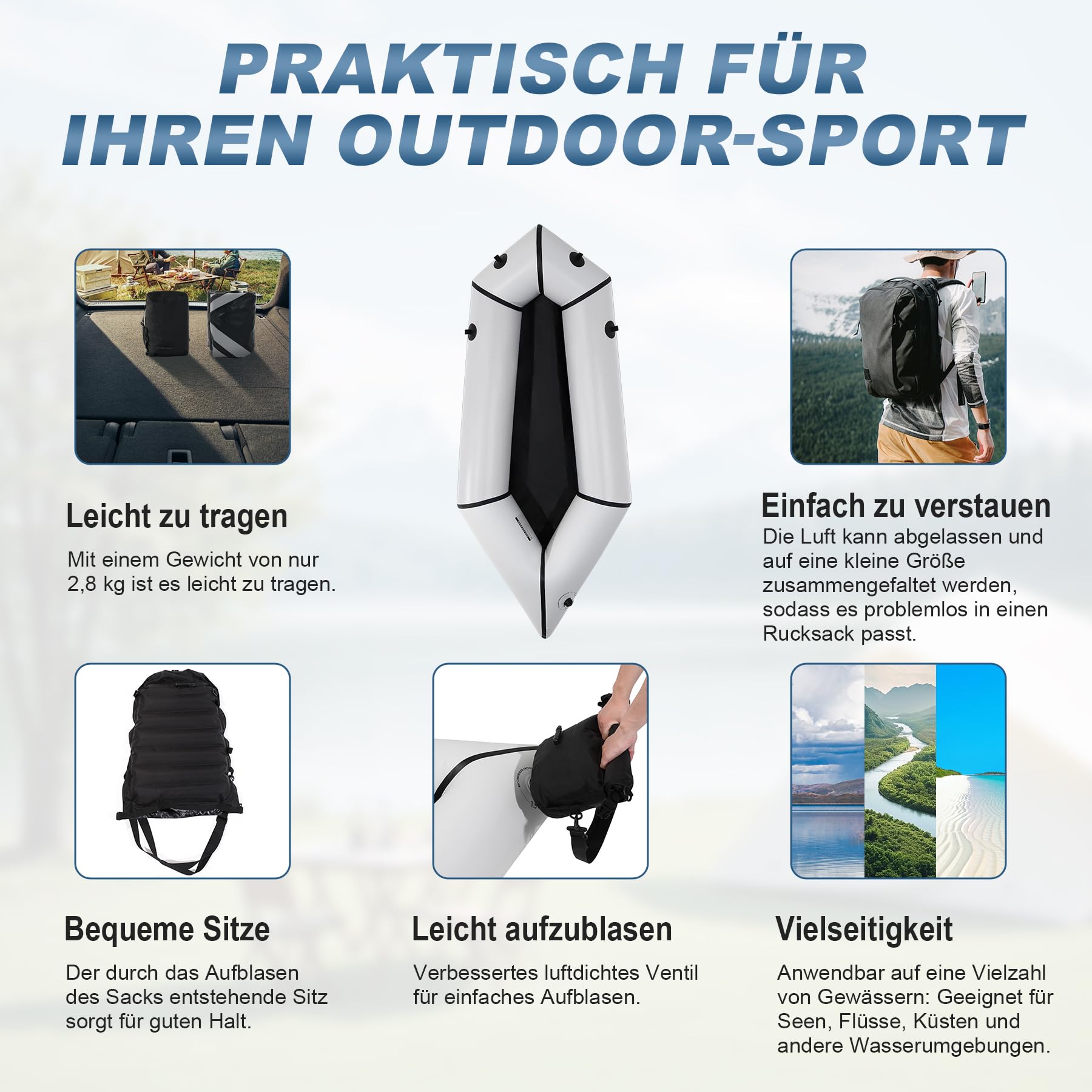 Abenteuer warten! Dieses superleichte TPU-Schlauchboot ist dein perfekter Begleiter für alle Wasseraktivitäten. Mit 210cm Länge bietet es genug Platz für eine Person (max. 150kg Tragkraft) und sogar deinen Hund kannst du mitnehmen! Das TPU-Material ist viel robuster als PVC - reißfester, flexibler und umweltfreundlicher. Doppelte Nähte sorgen dafür dass keine Luft entweicht. Der absolute Clou: Das 3-in-1 Sitzkissen dient als Aufblashilfe, Sitz und Tragetasche! Zusammengefaltet ist das Boot nur 24x24x42cm groß und wiegt knapp 2,8kg - passt also in jeden Rucksack. Mit den Boston-Ventilen bläst du es fix auf und die 4 Aufhängepunkte sind praktisch für deine Ausrüstung. Ob Angeln, Flachwasser-Rafting oder einfach nur Entspannung auf dem See - mit diesem Packraft bist du perfekt ausgerüstet für dein nächstes Outdoor-Abenteuer!