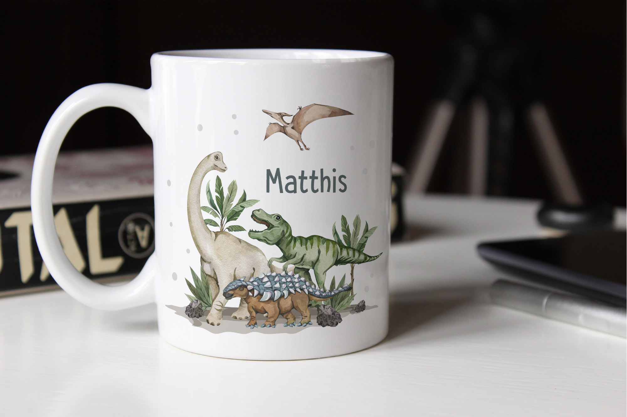 Zur Einschulung was ganz Besonderes verschenken? Diese personalisierte Dino-Tasse wird zum absoluten Liebling jedes Schulkindes! Mit dem eigenen Namen drauf und einem süßen Dinosaurier-Motiv - was will man mehr?