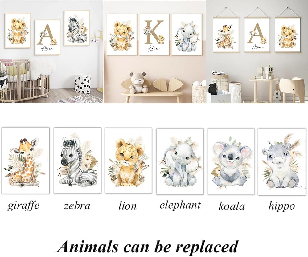 Personalisiertes Baby Poster Set - 3 Leinwandbilder Mit Namen & Tieren 30x40cm