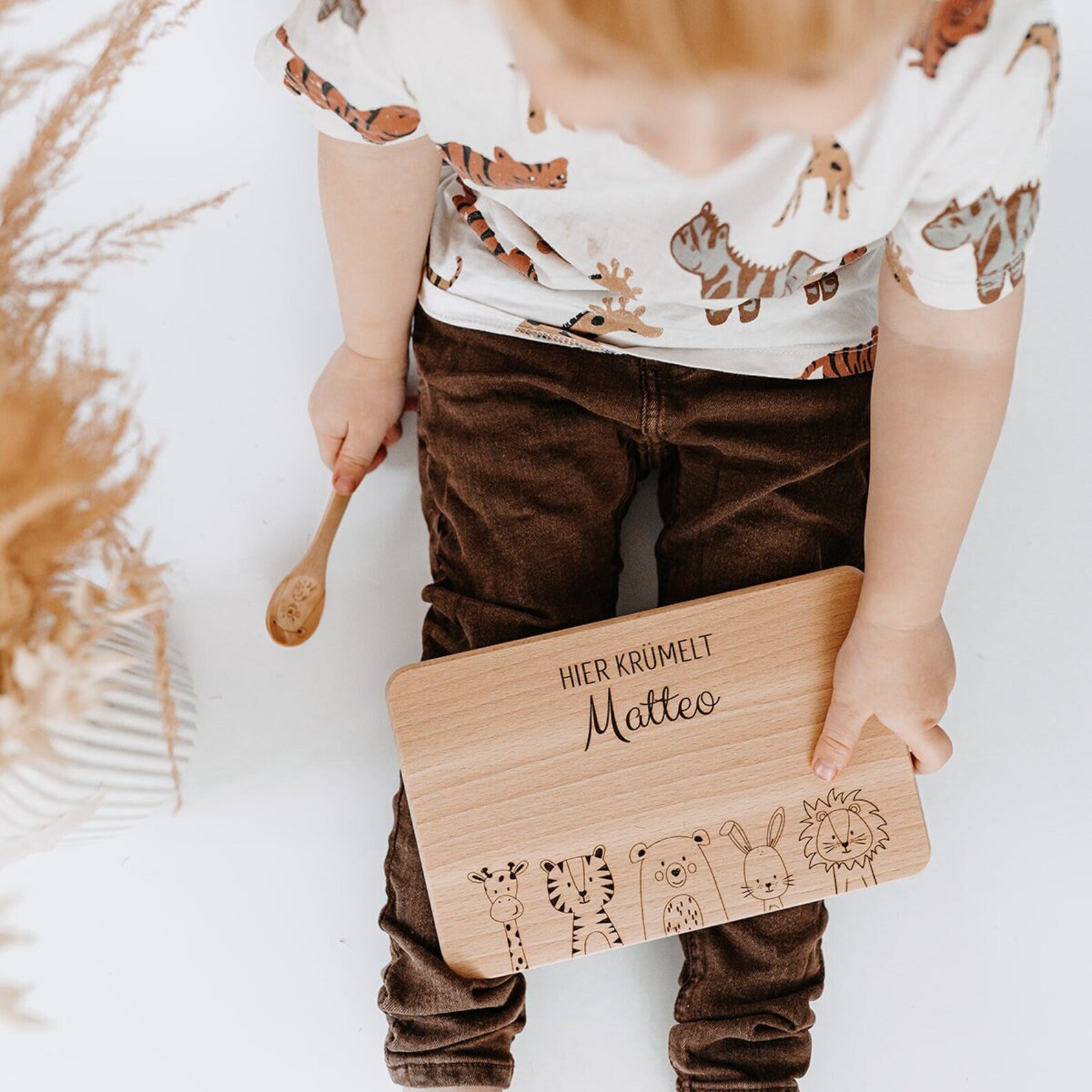 Starte den Tag mit einem Lächeln! Dieses personalisierte Frühstücksbrettchen wird mit dem Namen deines Kindes und einem süßen Tiermotiv graviert. Aus hochwertigem Buchenholz in 22x14cm Größe. Handgefertigt in Hamburg mit Liebe zum Detail. Perfekt für das tägliche Frühstück oder als besonderes Geschenk zur Taufe, Geburtstag oder Geburt. Einfach mit feuchtem Tuch reinigen - nicht spülmaschinenfest. Mach deinem Kind eine Freude mit diesem einzigartigen Unikat!