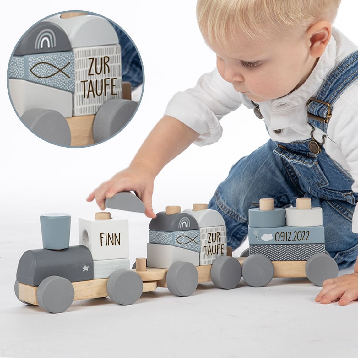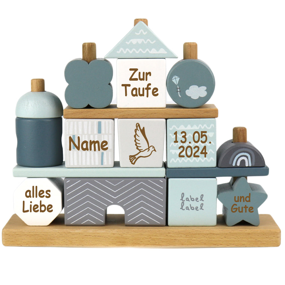 Was für ein süßes Taufgeschenk! Dieses Steckspiel in Häuschen-Form aus Holz kann mit Namen und Taufdaten personalisiert werden. Maße: 23x6x18cm, in Blau erhältlich. Die Gravur wird per Laser eingebrannt - super hochwertig und langlebig. Fördert Feinmotorik, Geschicklichkeit und Hand-Auge-Koordination bei Kindern. Entwickelt in Dänemark, Belgien, Niederlanden und Schweden. Ein bleibendes Andenken an den besonderen Tag. Einfach Daten angeben und sich über ein einzigartiges Geschenk freuen!