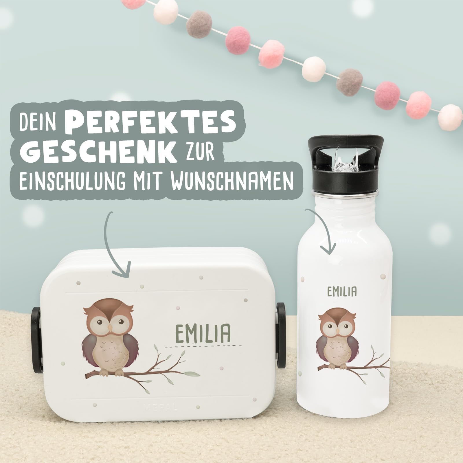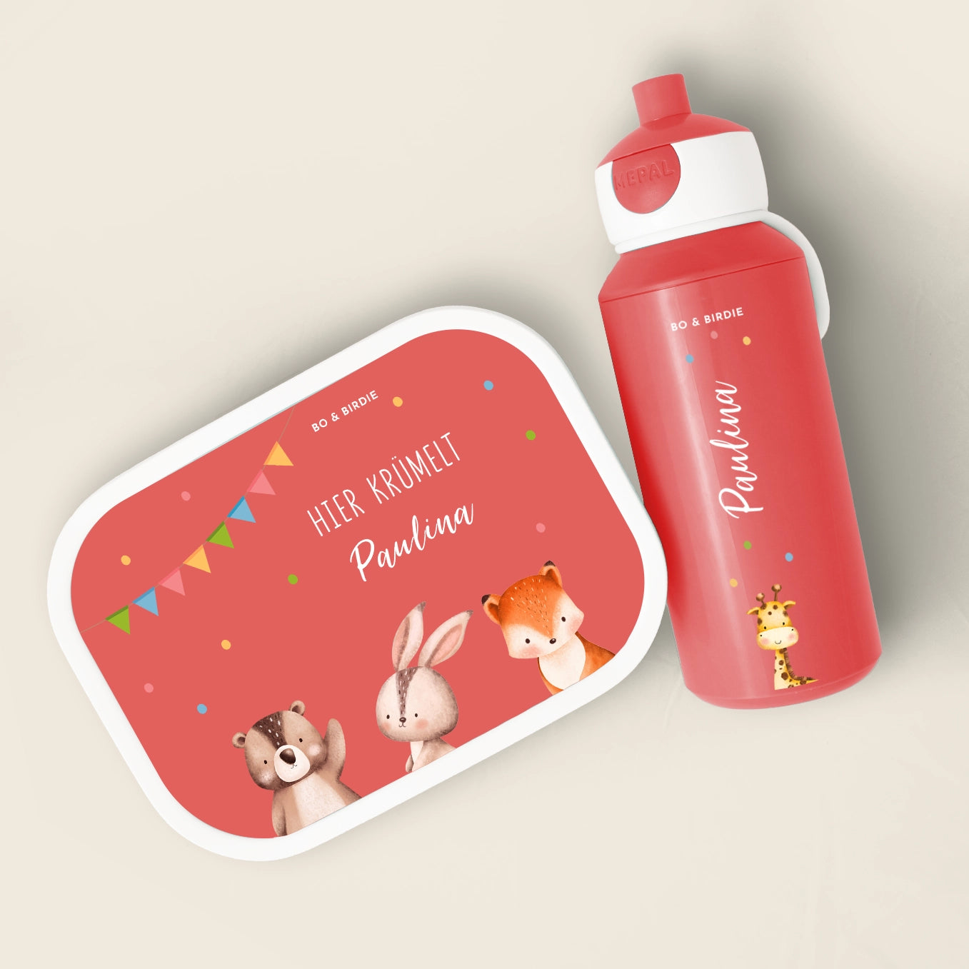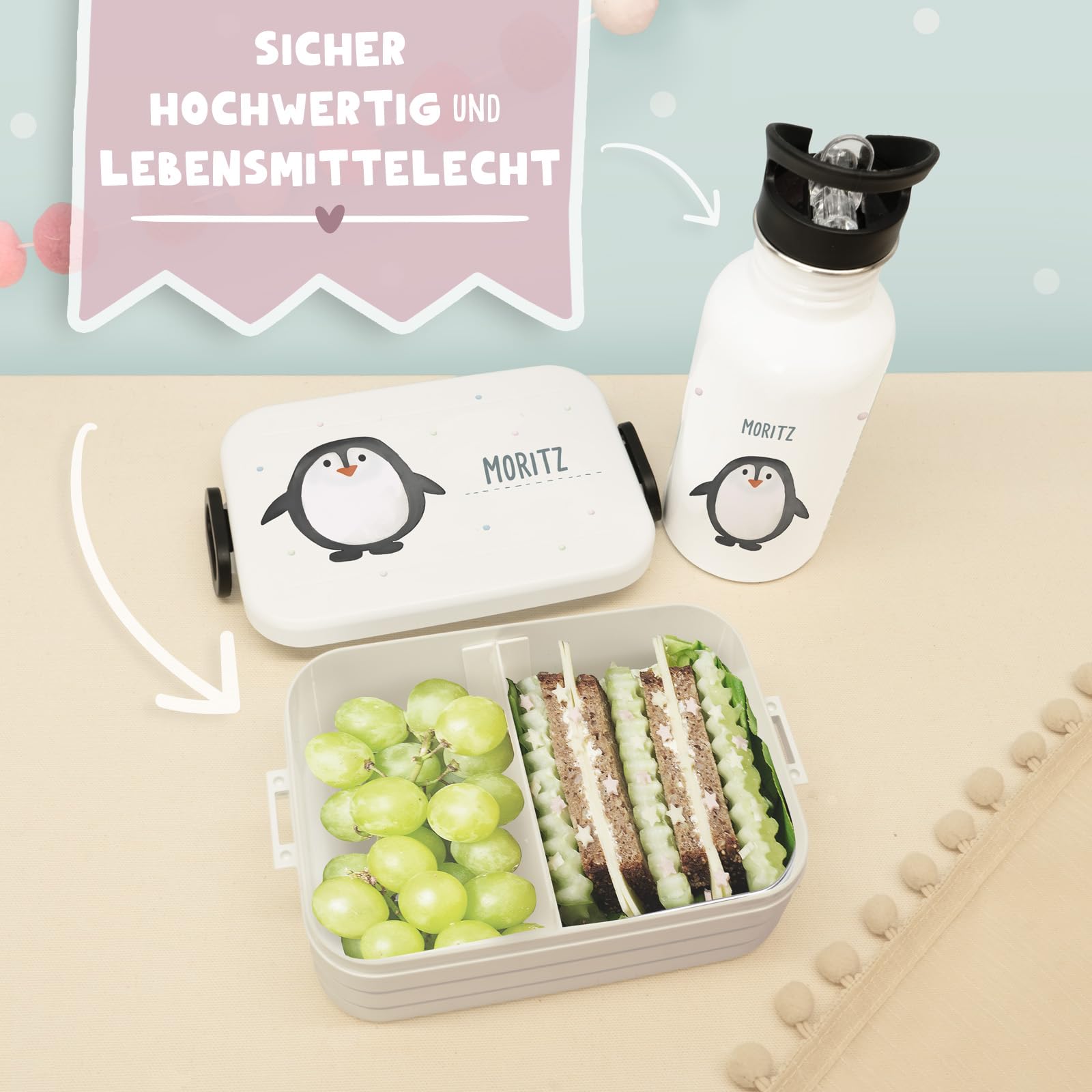 Das perfekte personalisierte Set für Kindergarten und Schule! Dein Kind bekommt eine hochwertige Mepal 'Take a Break' Lunchbox mit 900ml Fassungsvermögen UND eine 500ml Edelstahl-Trinkflasche - beide mit dem Namen deines Kindes und einem süßen Tiermotiv wie Löwe, Fuchs oder Eule. Kein Verwechseln mehr in der Brotzeitpause! Die Brotdose hat praktische Trennwände oder einen Bento-Einsatz mit Gabel, die Trinkflasche einen auslaufsicheren Deckel mit Trinkhalm. In strahlendem Weiß mit bunten Motiven, die durch spezielles Verfahren dauerhaft haltbar sind. Ein Set, das nicht nur praktisch ist, sondern auch emotional - dein Kind wird es lieben!