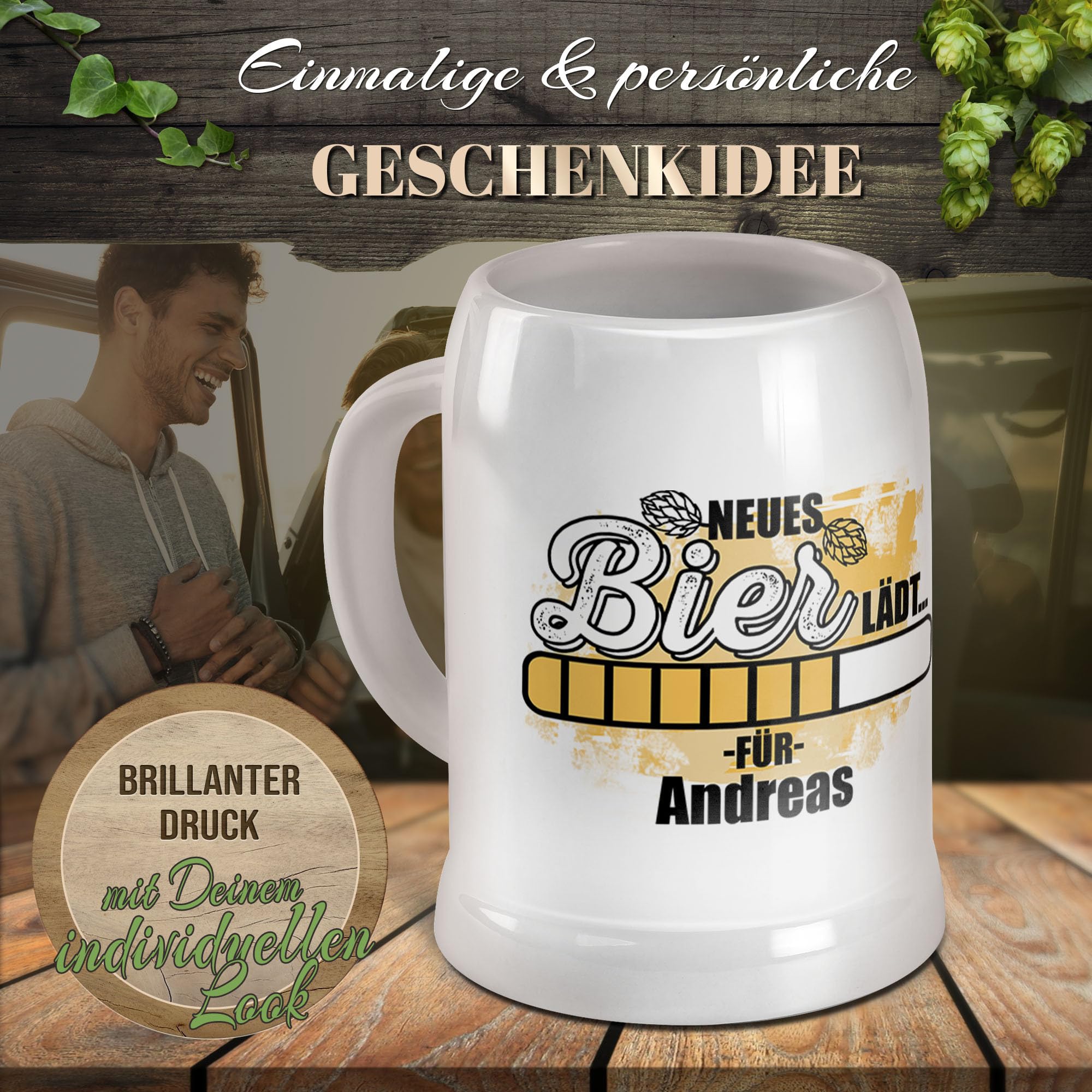 Das perfekte Geschenk für jeden Biertrinker! Dieser 500ml Bierkrug aus Keramik wird mit deinem Wunschtext personalisiert - einfach Namen oder Spruch auswählen. Verschiedene Schriftarten und Farben stehen zur Verfügung. Made in Germany in hauseigener Druckerei. Robust und spülmaschinenfest, mit 13,8cm Höhe. Ideal für Vatertag, Geburtstage, Weihnachten oder einfach so. Ein einzigartiges Geschenk, das garantiert begeistert. Bestelle jetzt und mach den Bierkrug zu einem Unikat - denn persönliche Geschenke kommen immer am besten an!