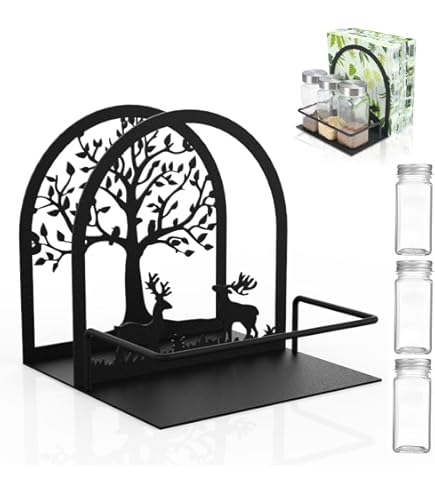 Ordnung muss sein - und mit diesem stylischen Serviettenhalter wird dein Esstisch zum echten Hingucker! Das schwarze Metall-Teil mit dem coolen Baum-und-Hirsch-Design ist nicht nur superpraktisch, sondern sieht auch noch richtig edel aus. Auf der einen Seite hast du Platz für deine Papierservietten, auf der anderen Seite stehen bequem bis zu drei Gewürzstreuer bereit. Nie wieder langes Suchen nach Salz und Pfeffer! Das hochwertige Metall ist rostfrei und kratzfest - hält also ewig. Mit den vier Anti-Rutsch-Füßen bleibt der Halter stabil stehen und zerkratzt deine Tischplatte nicht. Perfekt für die Küche, das Esszimmer oder sogar fürs Restaurant. Und das Beste: Keine Montage nötig - einfach hinstellen und fertig! Im Lieferumfang sind sogar drei durchsichtige Salz-Pfeffer-Streuer dabei. Ein tolles Geschenk für alle, die Wert auf stilvolles Tischdekor legen. Dein Esstisch wird sich freuen!