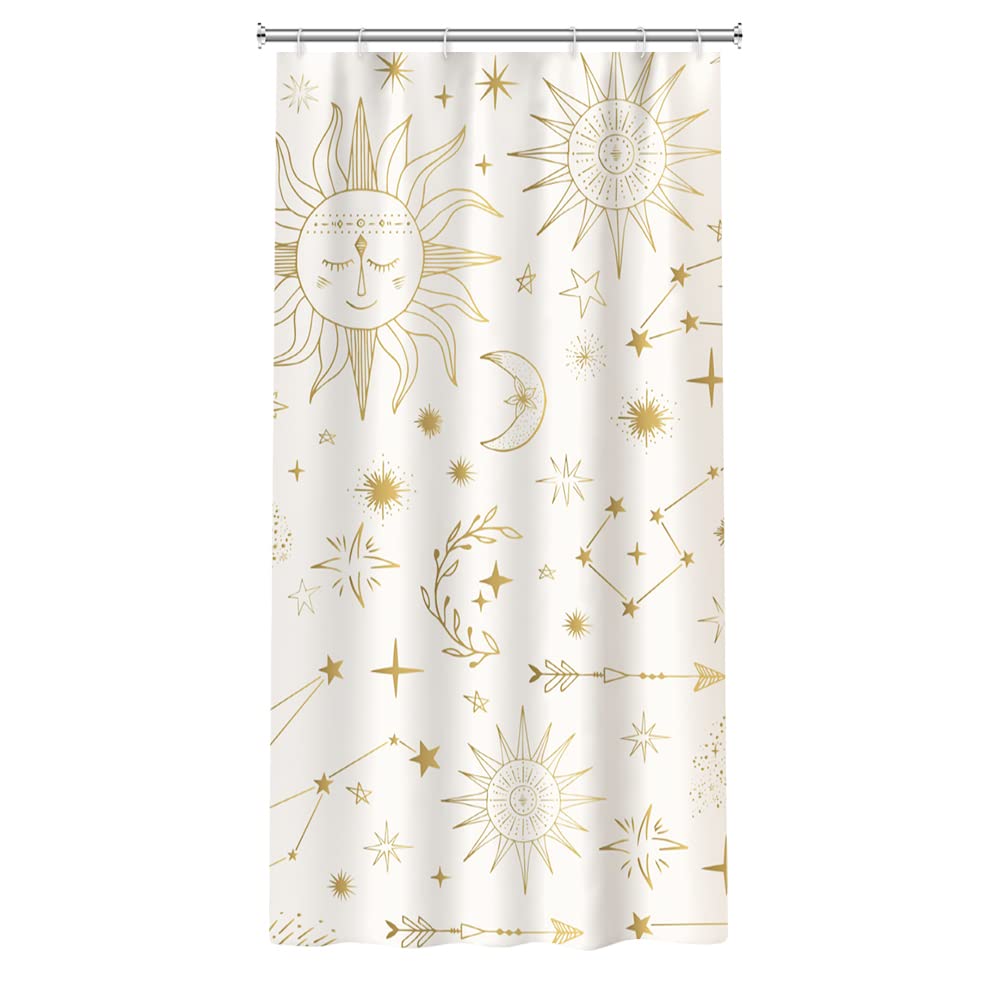 Bring himmlische Atmosphäre in dein Bad! Dieser wunderschöne Duschvorhang im warmen Pfirsich-Ton zeigt ein traumhaftes Design mit Sonne, Mond und Sternen. Aus 100% Polyester gefertigt, wasserdicht und weich im Griff. Mit 12 Metallösen für einfache Montage an jeder Duschstange. Maschinenwaschbar ohne Farbverlust - einfach praktisch! Die künstlerischen Muster wurden digital gedruckt und sehen super detailreich aus. Perfekt fürs Badezimmer, Gäste-WC, Hotel oder Wohnheim. Macht jedes Bad sofort gemütlicher und persönlicher. Einfach aufhängen und schon strahlt dein Bad eine ganz besondere Stimmung aus. Frühling und Sommer-Feeling das ganze Jahr!