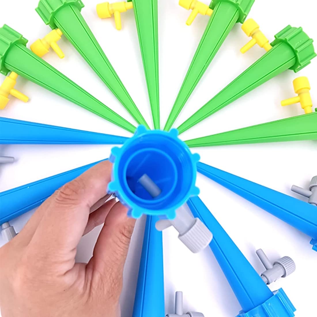 Perfekt für alle, die mal ein paar Tage weg sind! Diese 12 Selbstbewässerungsspitzen sorgen dafür, dass deine Pflanzen nicht vertrocknen. Einfach auf ne Wasserflasche schrauben und in die Erde stecken - das war's! Das Wasser wird langsam über 1-15 Tage abgegeben, je nach Einstellung. Passt für die meisten Standard-Wasserflaschen mit 2,54cm Durchmesser. Aus Polypropylen, in blau und grün. Super für Urlaub, Wochenendtrips oder einfach für vergessliche Gießer. Kann auch mit Pflanzendünger verwendet werden. Einfach installieren und sorgenfrei verreisen - deine Pflanzen bleiben grün und glücklich!