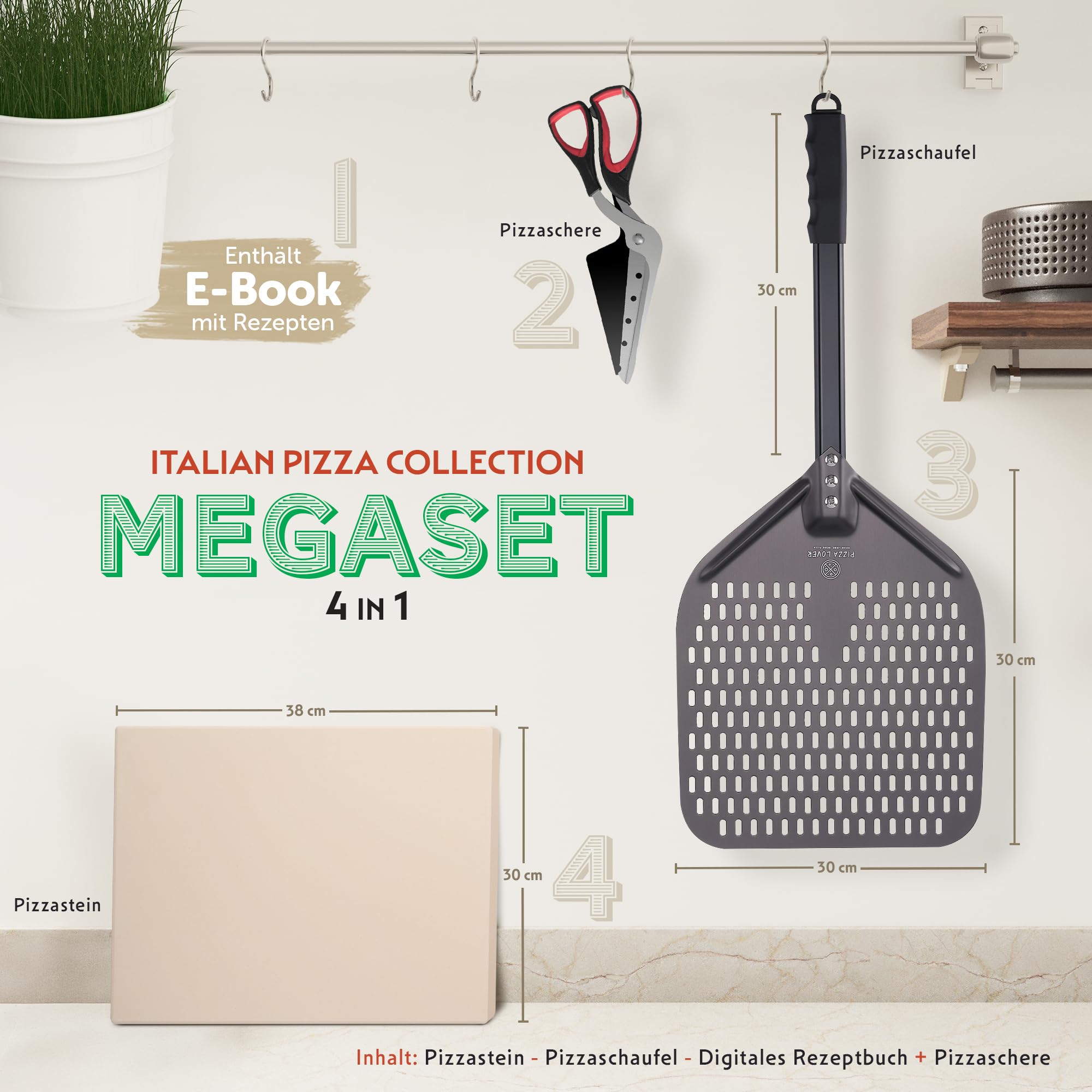 Pizza Lover 4in1 Pizzastein-Set Mit Cordierit-Stein Bis 800°C - Inkl. Schieber & Schere