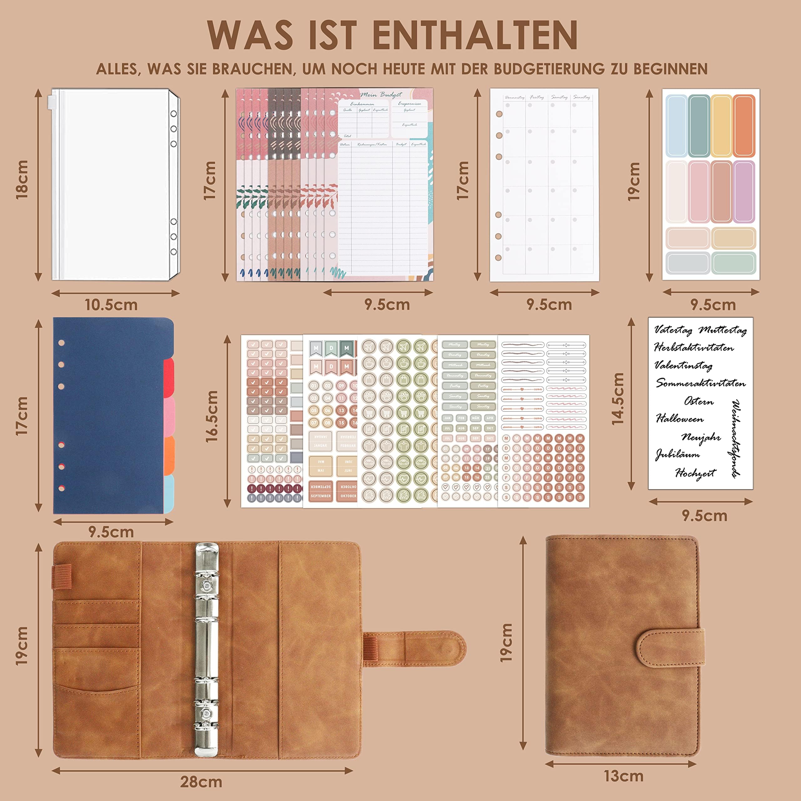 Endlich den Überblick über deine Finanzen behalten! Dieser deutsche Budget Planer im praktischen A6-Format hilft dir dabei. Im braunen PU-Leder-Einband - sieht nicht nur schick aus, sondern ist auch robust. Mit dabei: 12 doppelseitige Budgetblätter, 14 Wochennotizseiten, 8 Geldumschläge und über 200 Aufkleber. Alles im harmonischen Boho-Stil - macht sogar Spaß! Perfekt für Sparpläne, Haushaltskasse oder Reisebudget. Mit Metallknopf-Verschluss und Stiftschlitz - alles sicher verstaut. Ob für Studenten, Berufstätige oder Familien - hier behält jeder den Durchblick. Ein super Geschenk für alle, die ihr Geld clever verwalten wollen!