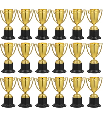 Diese süßen Cabilock Mini-Pokale machen jede Kinderparty zum Erfolg! 10 Stück im Set - jeweils 8,5cm hoch und 4,6cm breit. Aus sicherem, ungiftigem Kunststoff mit schönem Gold-Finish. Perfekt für Geburtstagsfeiern, Schulveranstaltungen, Sportwettbewerbe oder Firmenevents. Kinder ab 3 Jahren lieben diese Trophäen! Großartig als Belohnung für besondere Leistungen oder einfach als Party-Mitgebsel. Machen Kinder stolz und motivieren sie zu weiteren Erfolgen. Leicht und robust - halten auch wilden Kinderpartys stand. Ob fürs Kinderzimmer, die Vitrine oder als Erinnerungsstück - diese Pokale bringen strahlende Augen! Einfach zu verstauen und immer wieder verwendbar. Mach deine nächste Party unvergesslich!