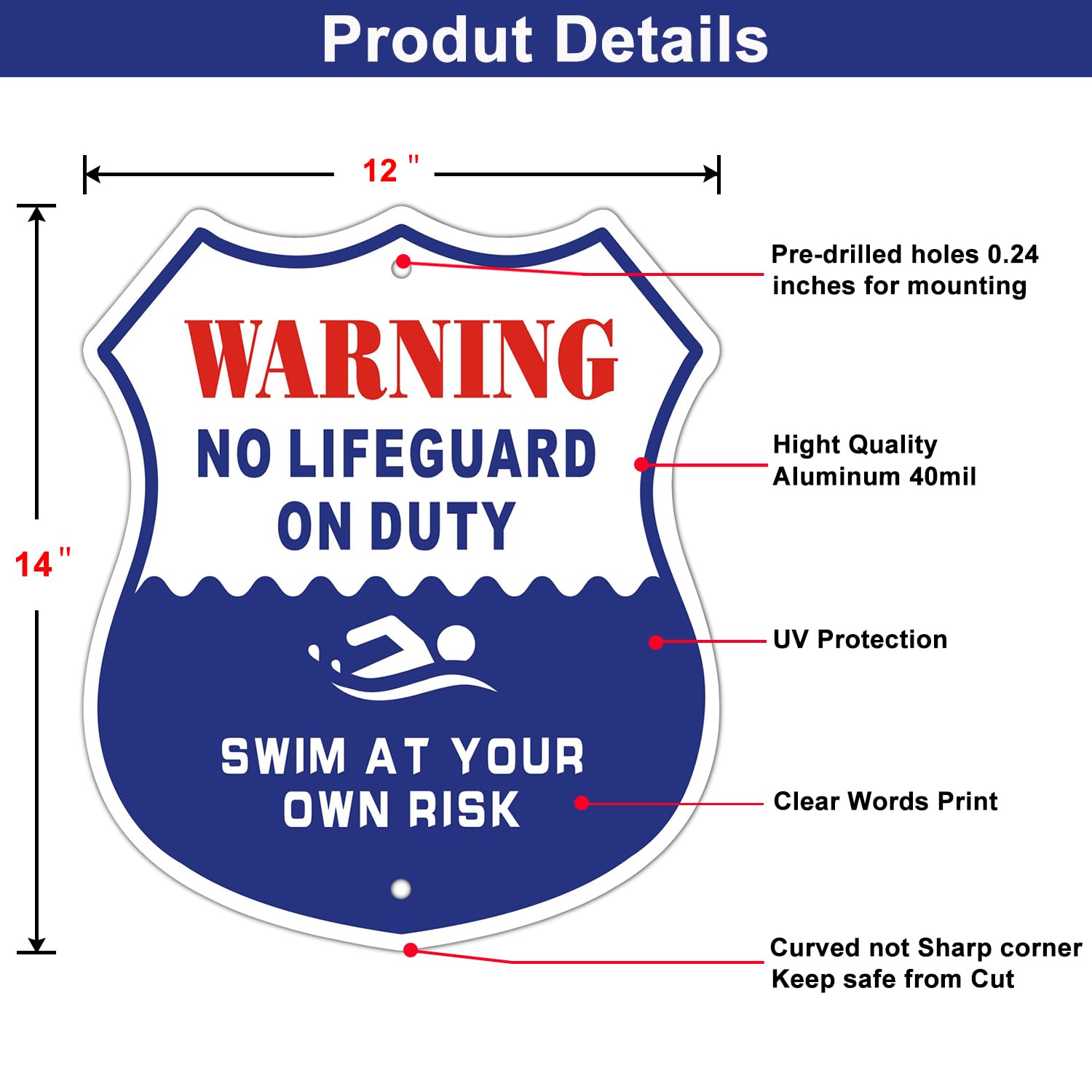 Sicherheit geht vor! Dieses professionelle Pool-Warnschild aus Metall macht deinen Poolbereich sicherer. Mit der klaren Aufschrift 'No Lifeguard On Duty - Swim at Your Own Risk' weist du alle Besucher auf die Eigenverantwortung hin. Aus robustem Aluminium, 20,3x30,5cm groß, wetterfest und verblasst nicht. Die vorgebohrten Löcher (0,3cm) machen die Montage super einfach. Perfekt für private Pools, Hotelanlagen oder Gemeinschaftsbäder. Wasserdicht, leicht zu reinigen und hält auch bei intensiver Sonneneinstrahlung. Schütze dich und deine Gäste mit diesem offiziell wirkenden Schild - besser safe than sorry!