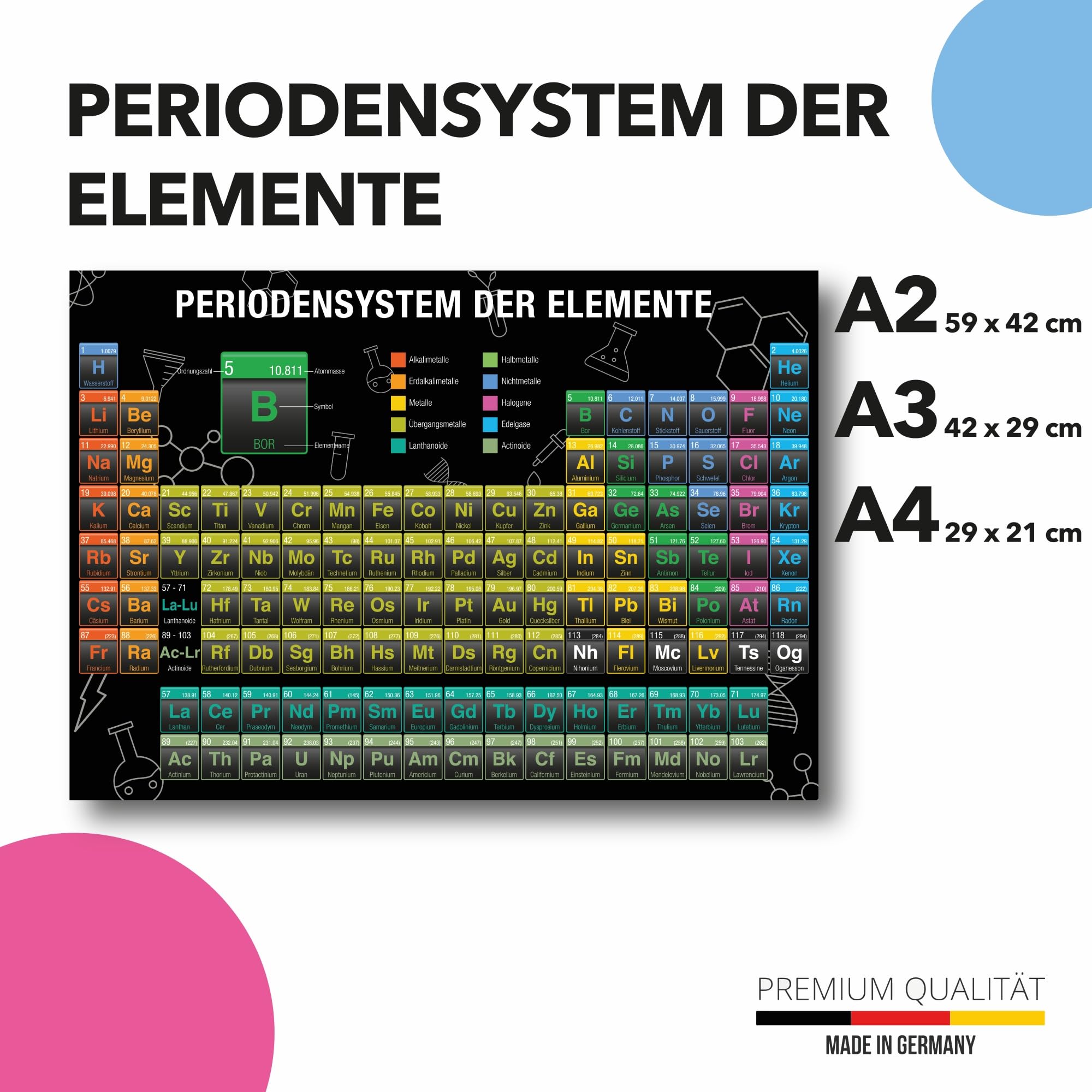Schüler, Studenten und Chemie-Begeisterte - dieses Periodensystem-Poster ist genau das Richtige für euch! In Deutschland hergestellt, mit höchster Druckqualität auf Fotopapier. Erhältlich in A2 (60x42 cm) mit weißem oder schwarzem Hintergrund. Perfekt für Klassenzimmer, Hörsäle, Labore oder das heimische Arbeitszimmer. Die klare Darstellung aller chemischen Elemente macht das Lernen zum Vergnügen. Ob für den Unterricht, die Prüfungsvorbereitung oder einfach als dekoratives Element - dieses Poster überzeugt durch Qualität und Inhalt. Einfach aufhängen und sofort loslegen mit dem Periodenpauken! Made in Germany - für langlebige Freude am Lernen.