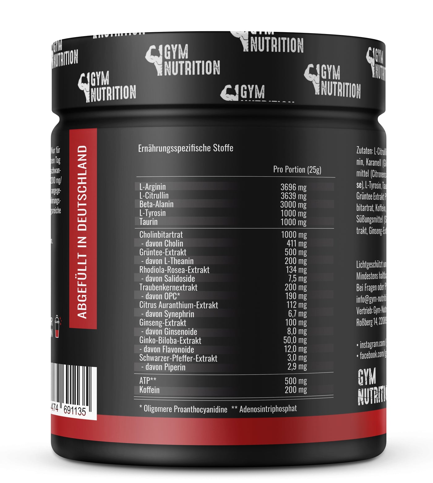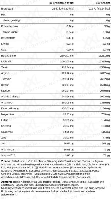 Alter, dieses Pre-Workout gibt dir den richtigen Kick für dein Training! Die Black Label Formel von XXL Nutrition ist der Nachfolger von Unlash und packt noch mehr Power in jede Portion. Mit nur 13 Gramp pro Portion liefert es dir Beta-Alanin für dieses typische Kribbeln, L-Citrullin für bessere Pump-Effekte und 200mg Koffein für maximale Energie. Aber das ist noch nicht alles - zusätzlich sind wichtige Vitamine und Mineralien wie Vitamin B12, C, D3, Magnesium und Zink enthalten. Perfekt für Kraftsport, CrossFit oder intensives Cardio. Einfach 30 Minuten vor dem Training mit 250ml Wasser mischen und du bist startklar. Mit nur 5kcal pro Portion und ohne Zucker oder Fett passt es perfekt in deine Diät. Der Red Fruit Geschmack ist super lecker und die Dose reicht für 30 Trainingseinheiten. Egal ob Anfänger oder Profi - mit diesem Booster holst du das Maximum aus deinem Workout raus. Aber pass auf: Nicht mehr als eine Portion pro Tag nehmen und immer ausreichend Wasser trinken!