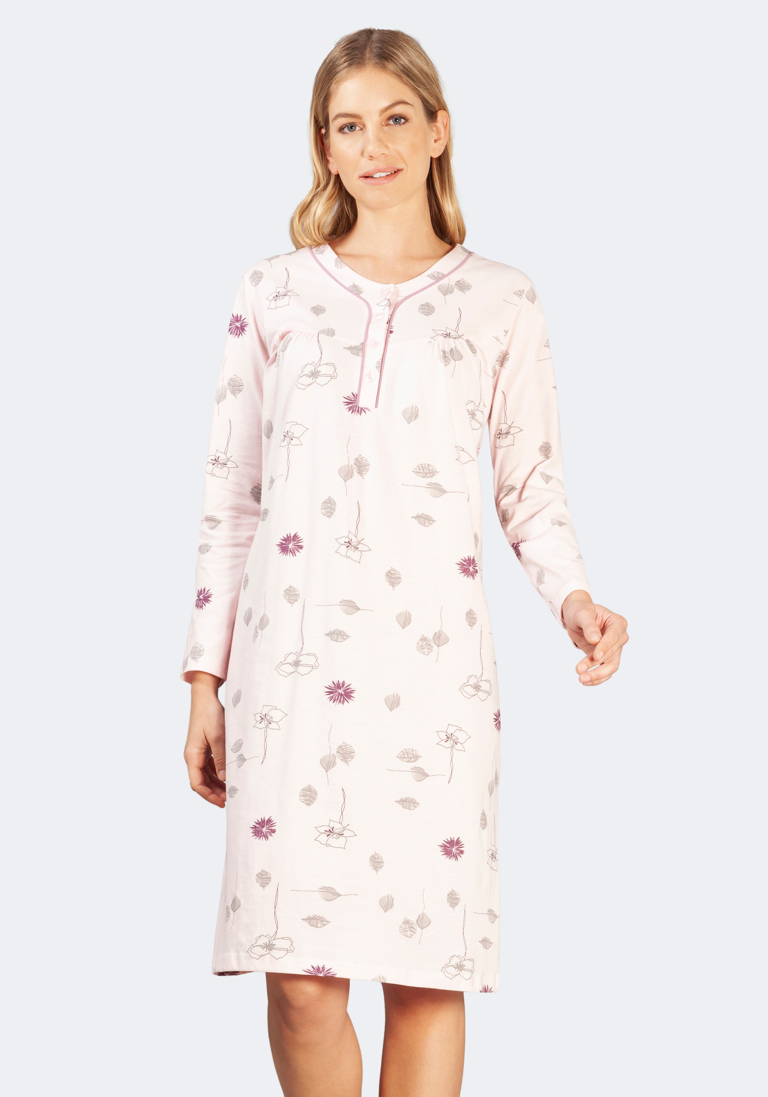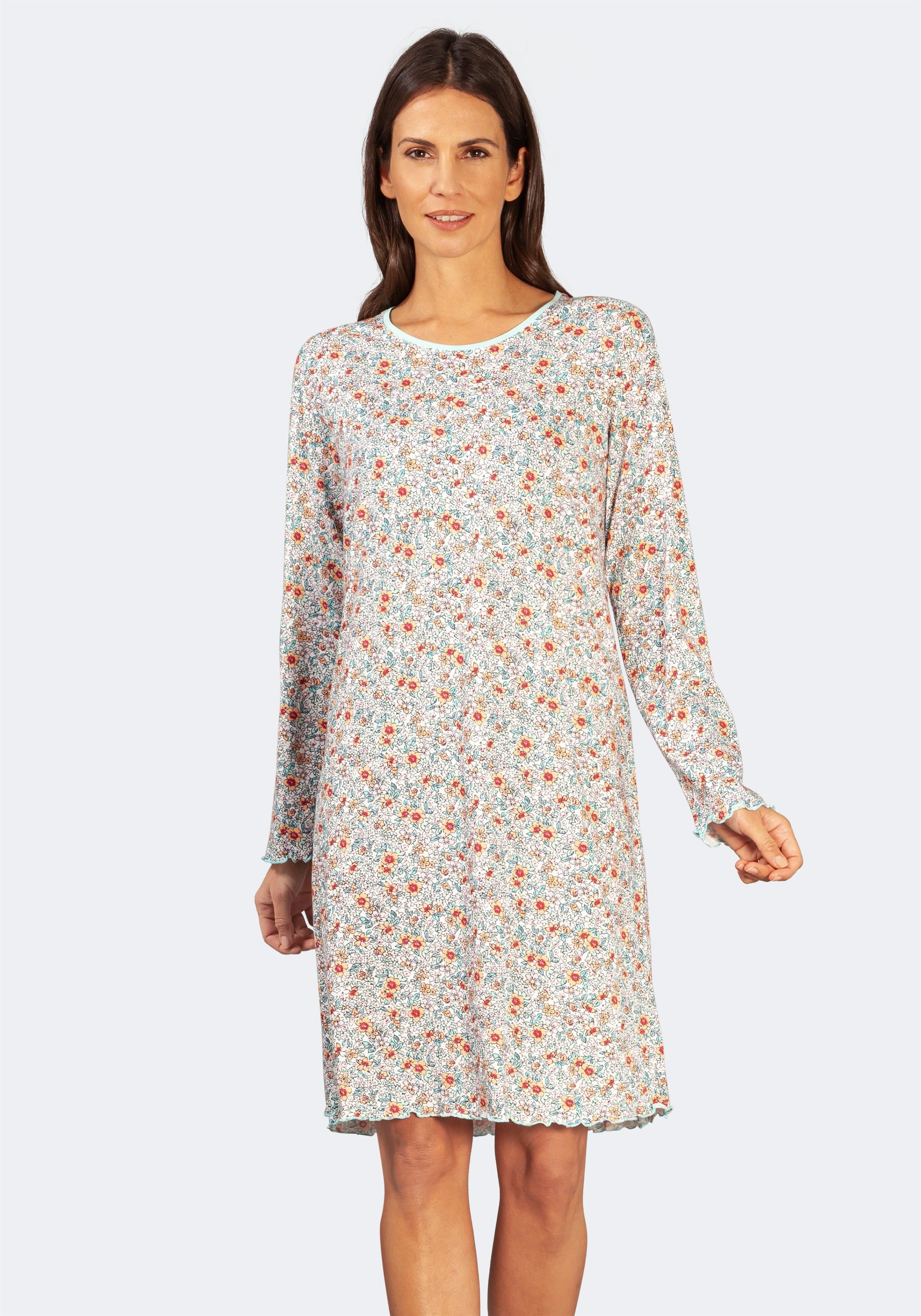 Genieße erholsame Nächte in diesem superweichen Nachthemd von hajo! Hergestellt aus 100% supergekämmter Premium-Baumwolle, die sich angenehm weich auf der Haut anfühlt und für optimalen Komfort sorgt. Das fröhliche Allover-Muster in zarten Pastelltönen verleiht dem Nachthemd einen verspielten Touch. Mit langen Ärmeln und einem dezenten Rundhalsausschnitt bietet es genug Wärme für kühlere Abende, ohne zu überhitzen. Die seitlichen Schlitze sorgen für zusätzliche Bewegungsfreiheit - perfekt für alle, die sich im Schlaf viel drehen. Die feminine Passform liegt an den richtigen Stellen an, ohne einzuengen. Besonders praktisch: Das Nachthemd ist extrem strapazierfähig und behält auch nach häufigem Waschen seine Form und Weiche. Ein echter Begleiter für Nacht für Nacht - ob alleine oder als Geschenk für liebe Freundinnen!