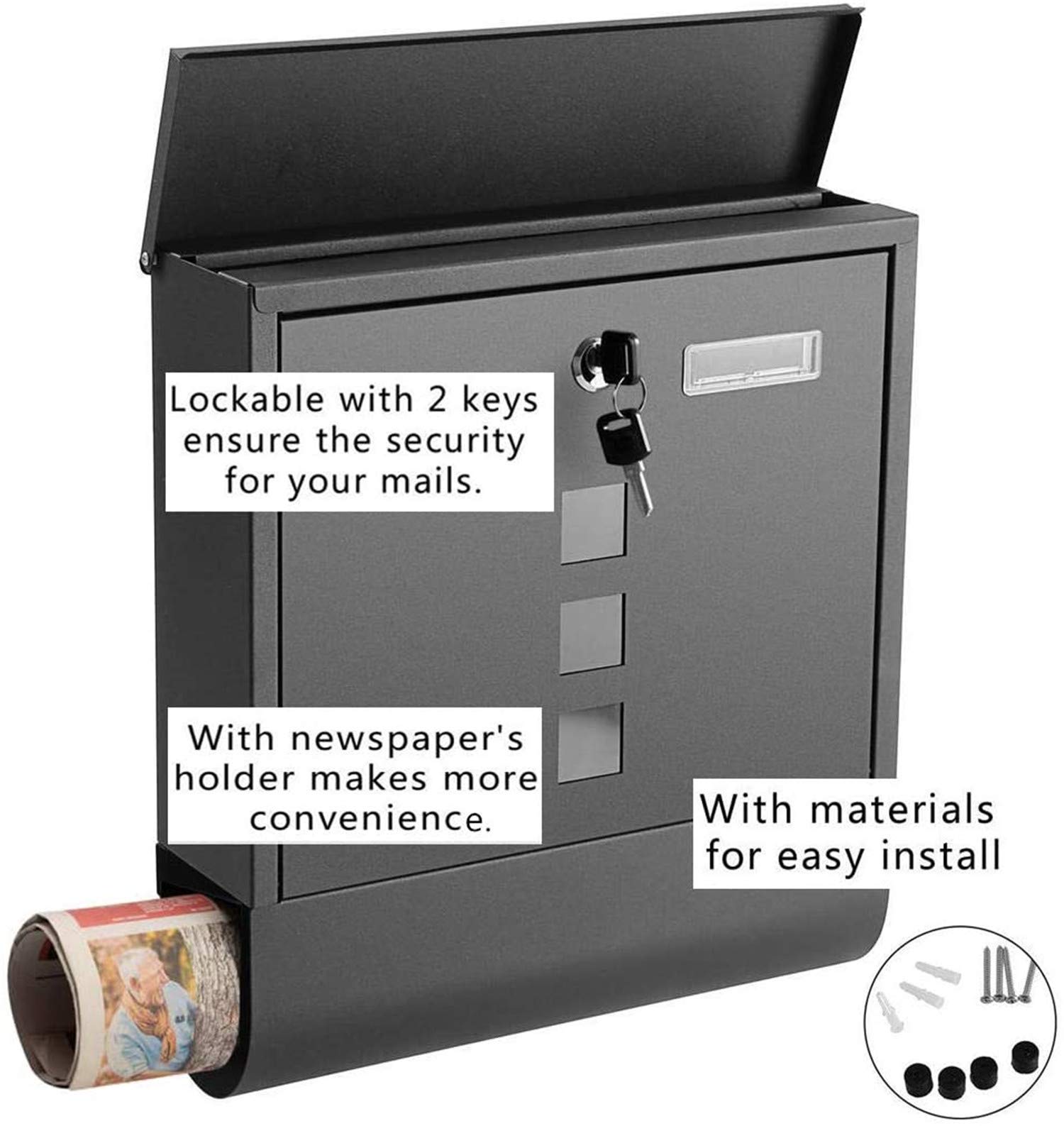 Modern, sicher und praktisch – dieser Premium-Briefkasten in Anthrazit! Mit Softclose-Dämpfer für leises Schließen, Sichtfenster zur Postkontrolle und integrierter Zeitungsrolle. Aus robustem Stahl, witterungsbeständig und mit Namensschild. Maße: 37x37x10 cm. Inkl. 2 Schlüssel und Montagematerial. Einfach an der Hauswand befestigen und deine Post ist sicher und geschützt. Sieht nicht nur gut aus, sondern macht auch jeden Eingangsbereich ordentlicher. Ein echter Hingucker!