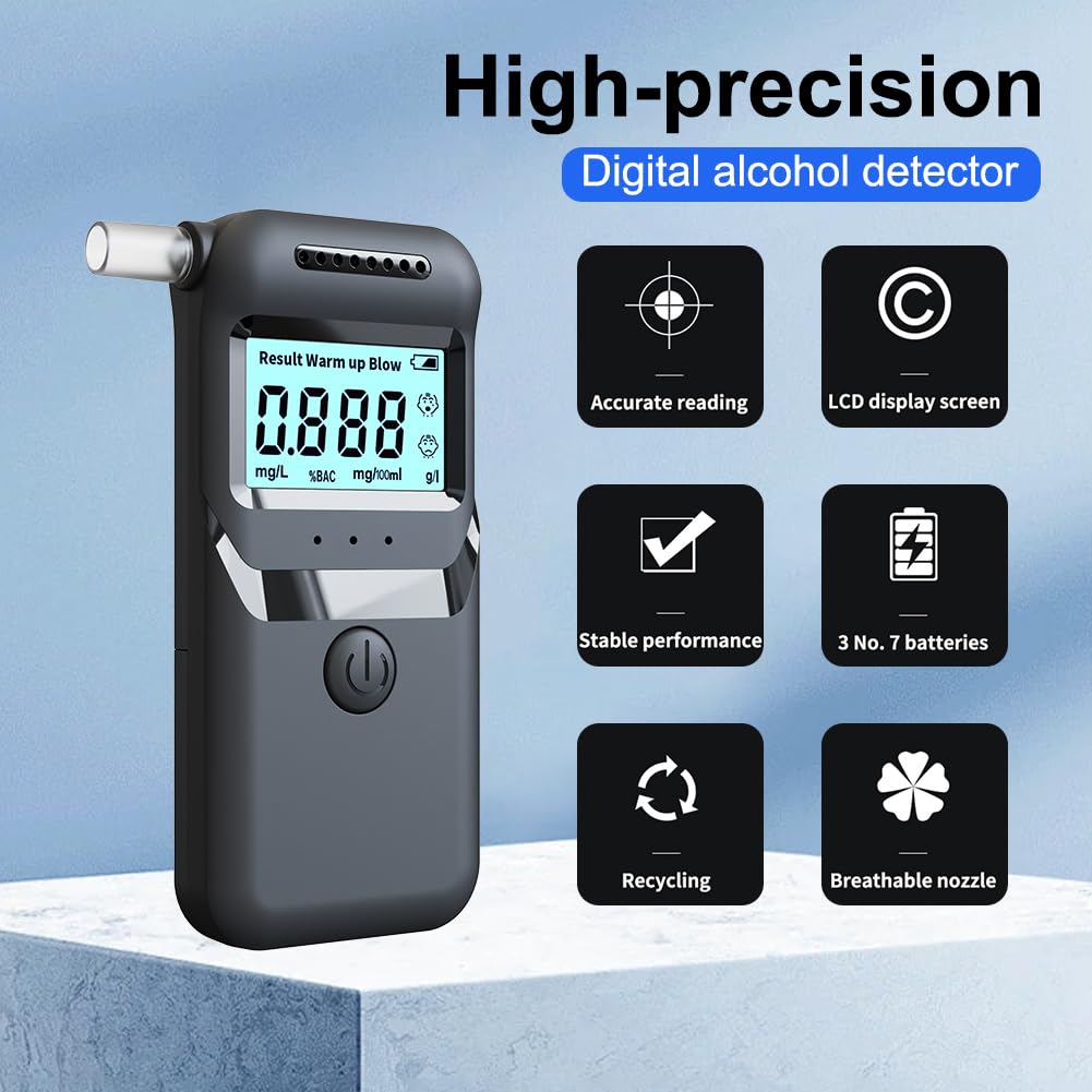 Bevor du nach einer Party ins Auto steigst - mach lieber schnell einen Test mit diesem Alkoholtester! Der zeigt dir sofort an, ob du noch fahren kannst oder besser ein Taxi nimmst. Mit seinen hochsensiblen Sensoren liefert er super genaue Ergebnisse, fast wie bei der Polizei. Die Bedienung ist total einfach: Einfach 3 AAA-Batterien rein, Mundstück aufstecken, einschalten und nach 15 Sekunden Aufwärmzeit 5 Sekunden lang reinpusten. Schon siehst du deinen BAC-Wert auf dem klaren LCD-Display. Besonders praktisch: Die farbigen LED-Lichter zeigen dir sofort, wo du stehst - grün bei 0-0,02%, gelb bei 0,02-0,05% und rot bei allem darüber. Für die genauesten Ergebnisse wartest du am besten 20 Minuten nach dem letzten Drink und machst drei Tests für einen Durchschnittswert. Mit nur 77 Gramm ist das Gerät super leicht und passt in jede Handtasche oder ins Handschuhfach. Und keine Sorge wegen der Hygiene - du bekommst 10 wiederverwendbare Mundstücke dazu, die du einfach reinigen kannst. Also, wenn du verantwortungsbewusst unterwegs sein willst und auf Nummer sicher gehen möchtest, ist dieser Alkoholtester ein absolutes Must-Have für jede Party und jeden geselligen Abend!