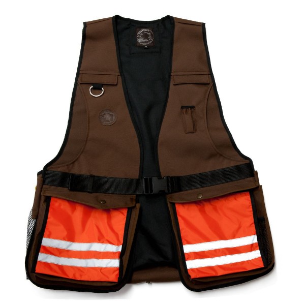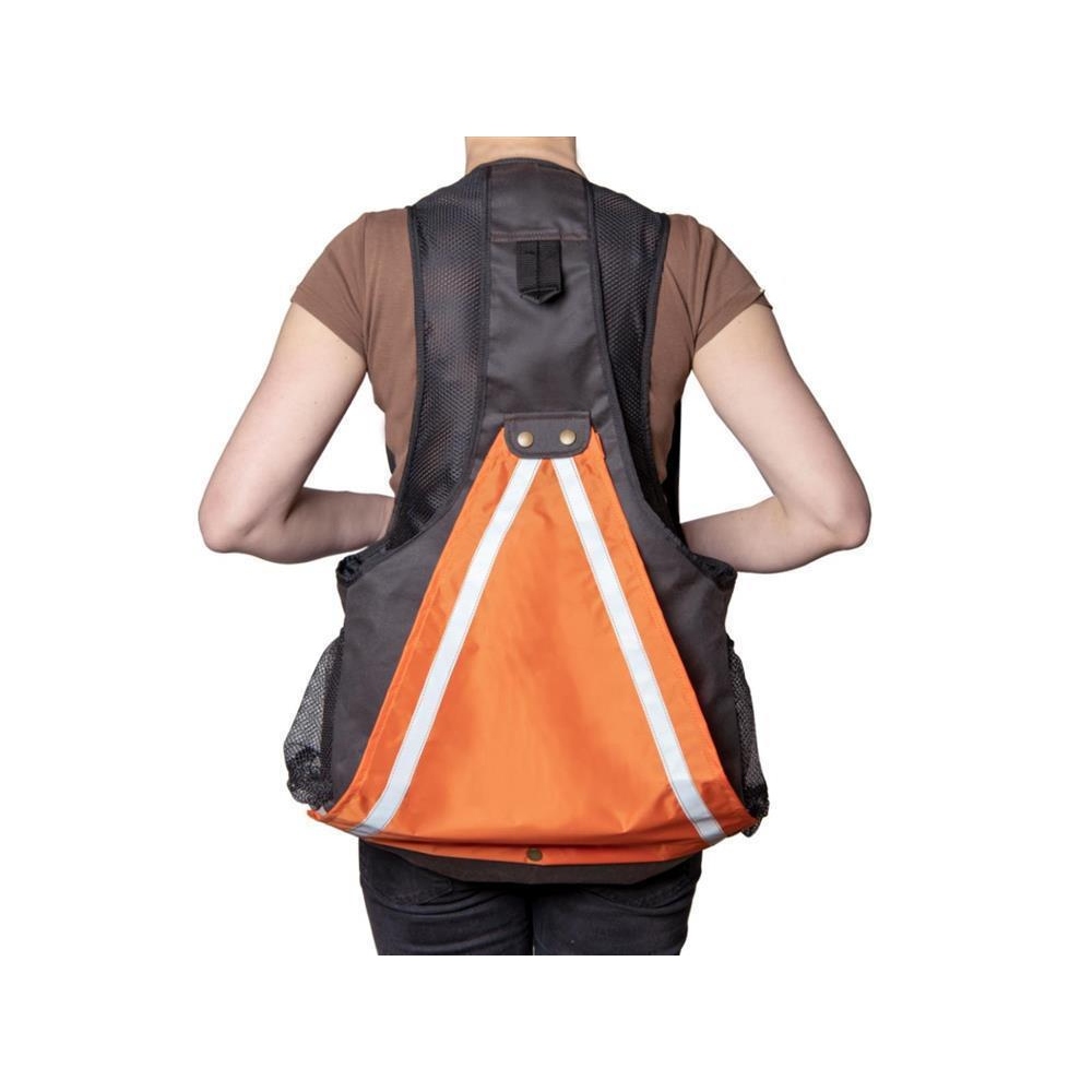 Die ultimative Weste für Jagd und Hundetraining! Die Mystique Dummyweste 'Profi' in braun gewachster Baumwolle ist handgefertigt und bietet Platz für alles, was du brauchst. Die große Rückentasche fasst 8-10 Dummys à 500g, die seitlichen Netztaschen nehmen Wasserflaschen für dich und deinen Hund auf. Die Fronttaschen haben orange Innentaschen mit Warnstreifen für Handy, Schlüssel und Geld - perfekt sichtbar auf der Jagd. Mit Netztaschen für Bälle, Karabinern für die Ballschleuder und speziellen Taschen für Zeckenzange oder Pfeife. Die Handtaschen schützen vor Wind und Wetter. Das Besondere: Der orange Warnteil mit Reflektorstreifen ist abnehmbar und kann gegen einen bestickbaren Teil getauscht werden. Leicht zu reinigen dank spezieller Beschichtung. Größe M für 165-175cm Körpergröße und 95-113cm Taillenumfang. Professionelles Equipment für anspruchsvolle Jäger und Hundetrainer!
