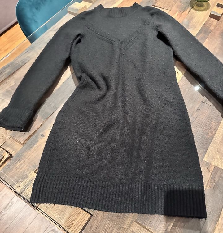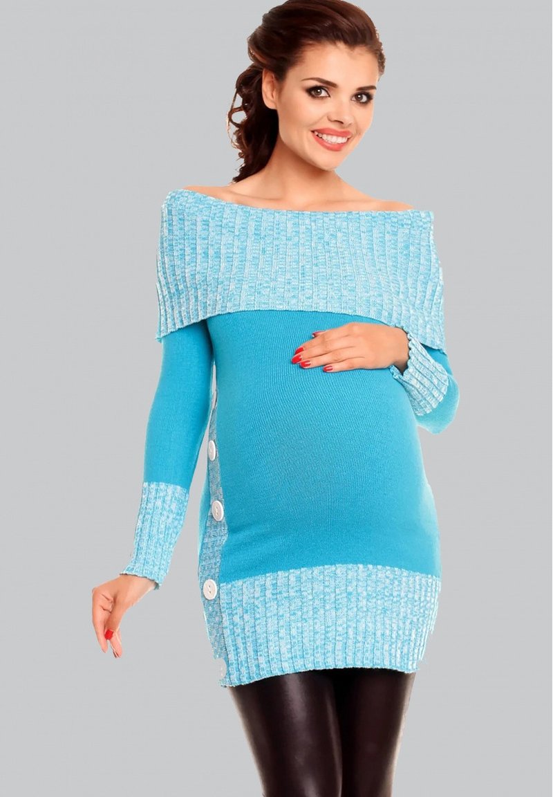 Schwangere Mamis aufgepasst! Dieses HAPPY MAMA Umstands-Strickkleid ist einfach nur kuschelig und super schick zugleich. Als Longpulli mit süßem Carmenausschnitt sitzt es perfekt und betont deine Babykugel auf die schönste Art. Das besondere Detail: Die seitlichen Zier-Knöpfe und der farblich abgesetzte Bundabschluss geben dem Kleid das gewisse Etwas. Aus flauschig warmem Material gefertigt, fühlt es sich einfach himmlisch weich auf der Haut an - genau das, was man in der Schwangerschaft braucht! Die Ripp-Strick-Bündchen an Kragen, Ärmeln und Bund sorgen für perfekten Sitz und zusätzlichen Komfort. Mit einer Länge von etwa 82 cm (kann je nach Größe etwas variieren) und Ärmellänge von ca. 59 cm bietet es genug Stoff, um deinen wachsenden Bauch optimal zu umschmeicheln. Perfekt für gemütliche Tage zu Hause, aber auch schick genug für unterwegs. Das Modell auf dem Bild ist 164 cm groß - so kannst du dir gut vorstellen, wie es bei dir sitzen wird. Einfach überziehen und sich rundum wohlfühlen - denn als werdende Mama hast du das verdient!