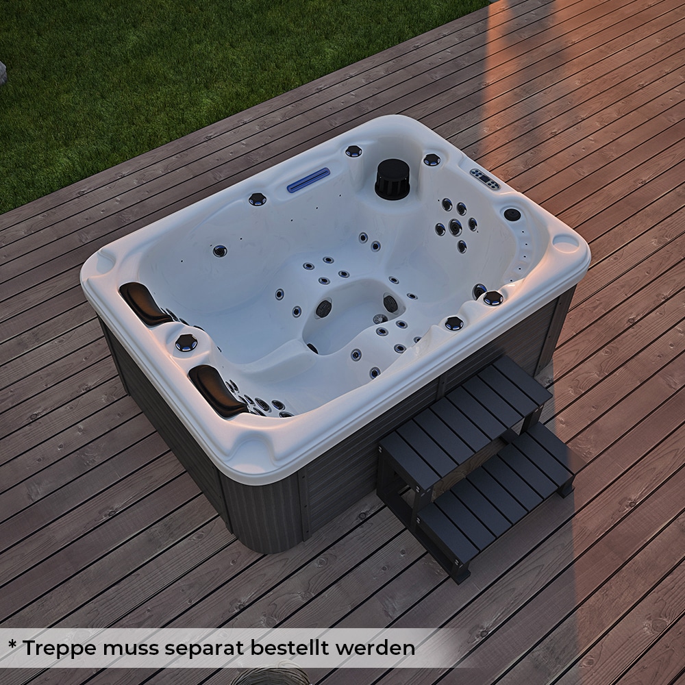Stell dir vor: Dein eigener Wellness-Bereich im Garten! Der Home Deluxe Sunset Pure Whirlpool macht's möglich. Mit 220x156x82cm bietet er Platz für bis zu 3 Personen und hat zwei gemütliche Liegeflächen mit Kopfkissen. Die 32 Massagedüsen und 13 LED-Lichtquellen sorgen für pure Entspannung. Und das Beste: Das Ozon-Reinigungssystem macht die Pflege super einfach - der Whirlpool reinigt sich quasi selbst! Die Acryl-Wanne in Weiß mit anthraziter WPC-Verkleidung sieht einfach edel aus. Touch-Display für einfache Bedienung, 3850W Leistung und nur 68dB Lautstärke. Perfekt für entspannte Abende unter freiem Himmel oder gesellige Runden mit Freunden. Lieferung per Spedition mit Terminabsprache - alles ganz unkompliziert. Hol dir das Urlaubsfeeling nach Hause! Ob nach einem stressigen Tag oder einfach so zum Genießen - dieser Whirlpool verwandelt deinen Garten in eine Oase der Erholung.