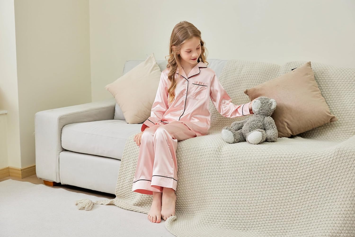 So süß schläft deine kleine Prinzessin! Dieser bezaubernde Satin-Pyjama von Fanient besteht aus einem kurzärmligen Oberteil mit Knopfleiste und einer langen Hose - beide super weich und bequem. Aus 95% Polyester und 5% Elasthan, hautfreundlich und angenehm zu tragen. Mit niedlichen Drucken wie Avocado, Schmetterlingen, Leoparden oder Katzen - da findet jedes Mädchen seinen Lieblingsstyle. Perfekt als Nachtwäsche, Lounge-Wear oder für gemütliche Tage zu Hause. Einfach in der Maschine waschbar (kaltes Wasser). Die Größen passen für Mädchen von 7-14 Jahren - am besten eine Nummer größer bestellen, dann hat deine Kleine noch Platz zum Wachsen. Ein ideales Geschenk für Geburtstage oder einfach so!