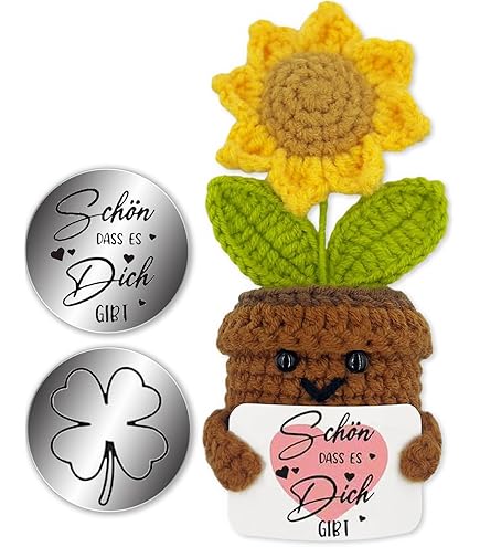Diese bezaubernd gehäkelte Blume im Topf ist mehr als nur eine Deko - sie ist ein echter Seelentröster! Handgefertigt aus weicher Woll-Baumwoll-Mischung fühlt sie sich an wie eine warme Umarmung. Das Komplett-Set enthält neben der gelben Blumenpuppe noch eine Holz-Schatzkiste mit Schloss, einen fröhlichen Regenbogen-Schlüsselanhänger und eine Motivationskarte mit aufbauenden Worten. Integriert ist ein Edelstahl-Glücksbringer mit graviertem Spruch. Perfekt als Schreibtischbegleiter im Büro, als Trostspender in der Handtasche oder als kuscheliger Mutmacher auf dem Nachttisch. Ein ideales Geschenk für Kollegen, Freunde oder Familienmitglieder in schwierigen Zeiten - oder einfach als Dankeschön für besondere Menschen in deinem Leben. Diese kleine Aufmerksamkeit strahlt Wärme und positive Energie aus!