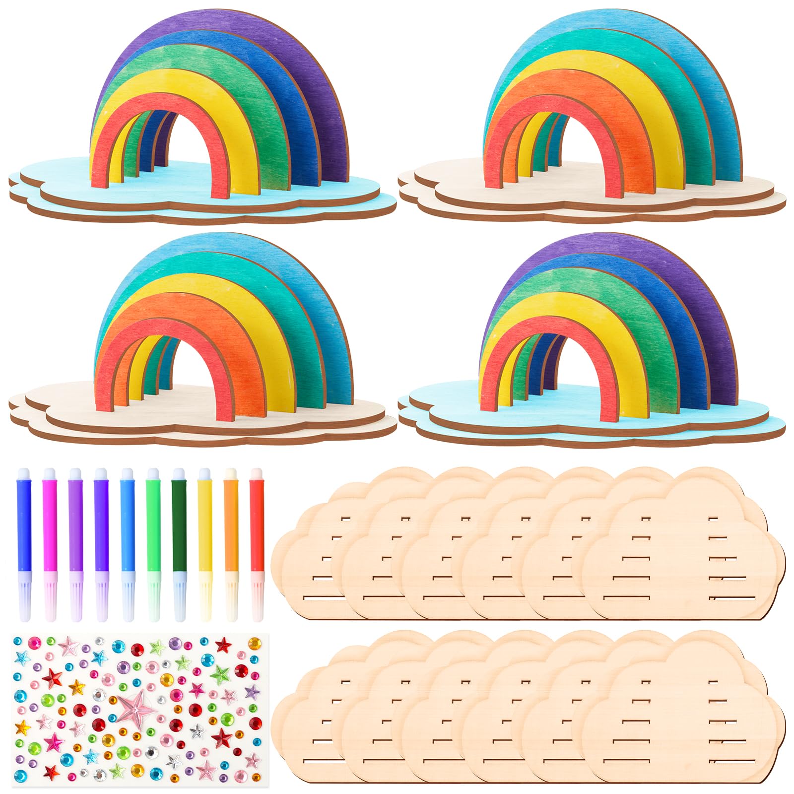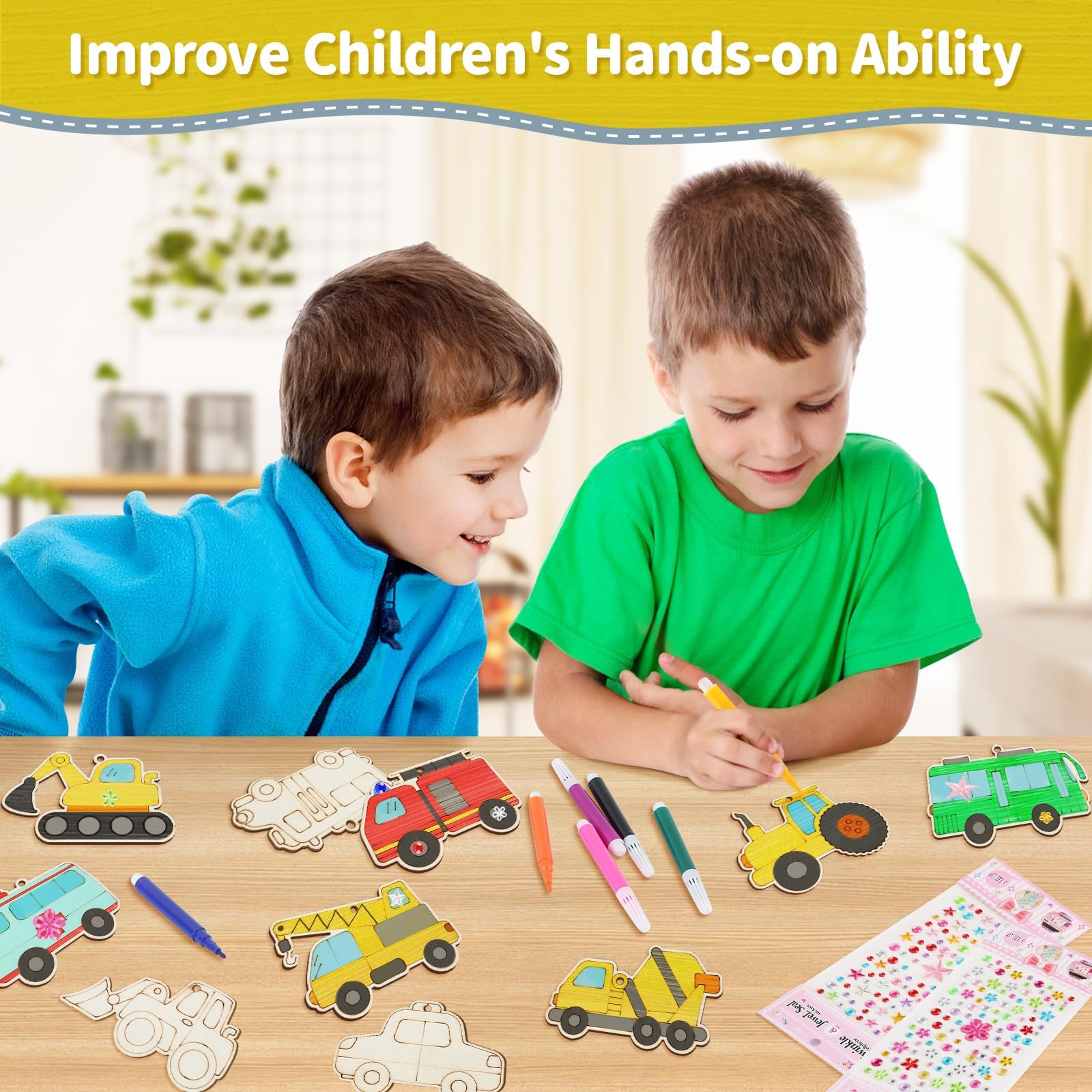 Qichan 32-teiliges Holz Bastelset Für Kinder - Mit 18 Fahrzeug-Figuren, Stiften & Glitzersteinen | Kreativ-Set