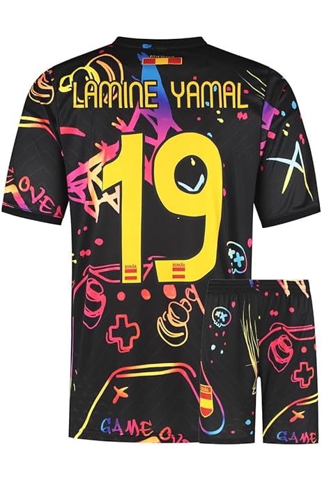 Dein kleiner Fußballfan wird dieses Yamal Trikot-Set lieben! Komplett mit Trikot, Shorts und passenden Socken im Barcelona-Design. Mit der Nummer 10 auf dem Rücken. Aus atmungsaktivem Material, super bequem für Sport und Freizeit. Größen von 128 (4-5 Jahre) bis 176 (12-13 Jahre). Tolle Geschenkidee für junge Fußballbegeisterte! Wichtig: Fan-Produkt, nicht offiziell lizenziert. Farben können je nach Bildschirm leicht abweichen. Mach dein Kind zum Star auf dem Bolzplatz - bestell das komplette Set jetzt!