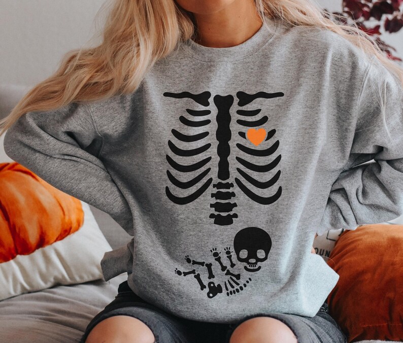 Die genialste Schwangerschafts-Ankündigung ever! Dieses lustige Skelett-Kostüm zeigt dein Baby als Röntgenbild im Rippenkäfig - einfach irre und total originell. Perfekt für Halloween-Partys oder um die Schwangerschaft auf humorvolle Art zu verkünden. Aus weichem Sweatshirt-Material (8.5 oz) mit klassischem Schnitt - bequem und dehnbar für den wachsenden Bauch. Mach deine Schwangerschaft zum unvergesslichen Erlebnis und sorg für staunende Blicke! Egal ob auf der Halloween-Party oder für Fotos - dieses Kostüm ist garantiert ein Highlight. Zeig der Welt dein kleines Skelett im Bauch - gruselig süß und total witzig!
