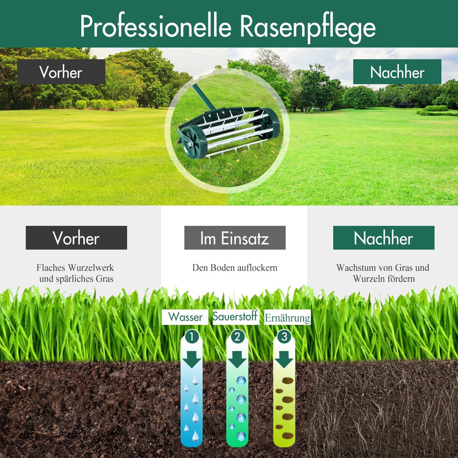 RELAX4LIFE Rasenbelüfter 44cm - Handvertikutierer Mit Stacheln Für Garten