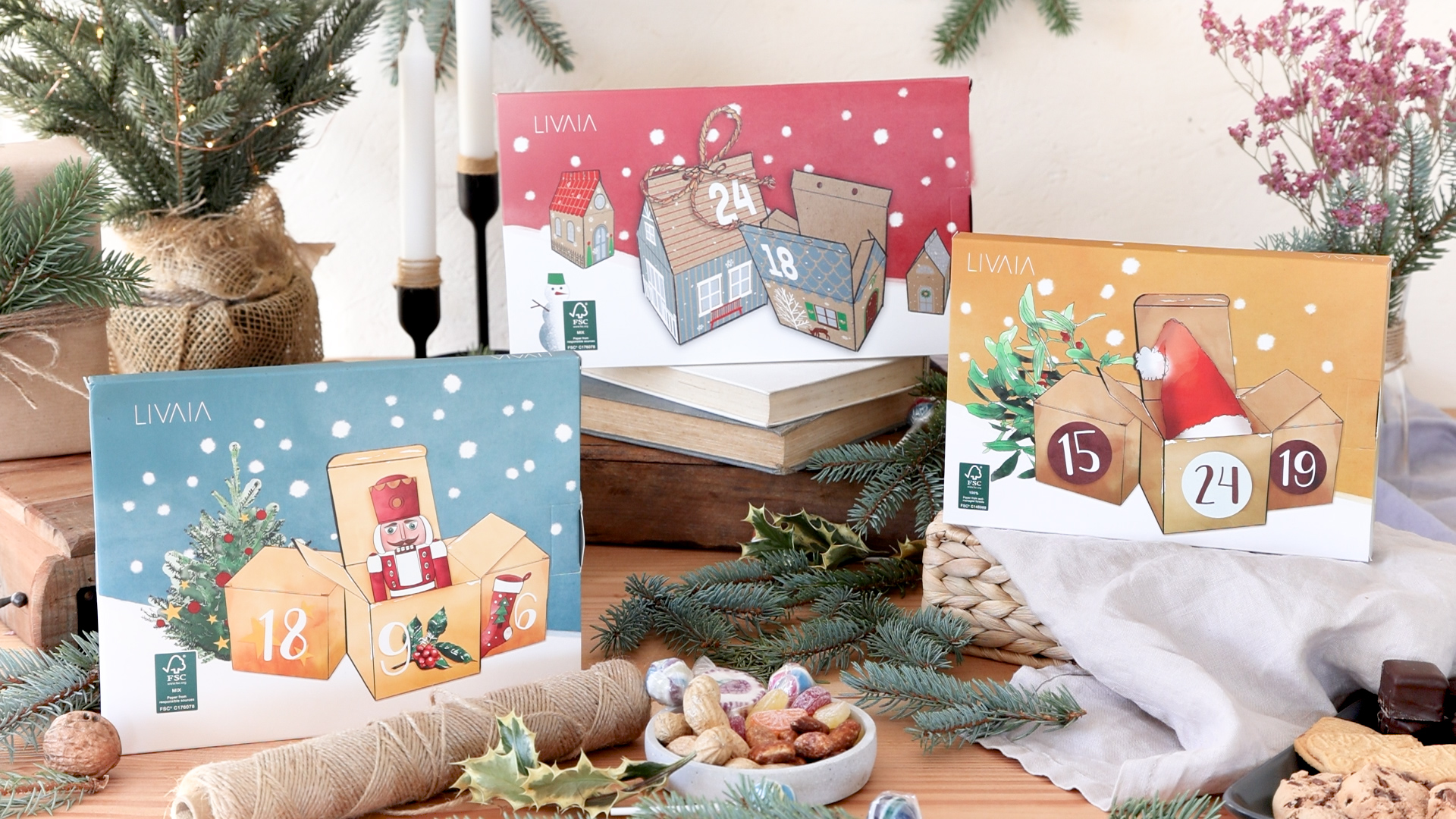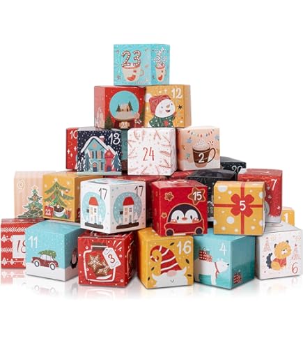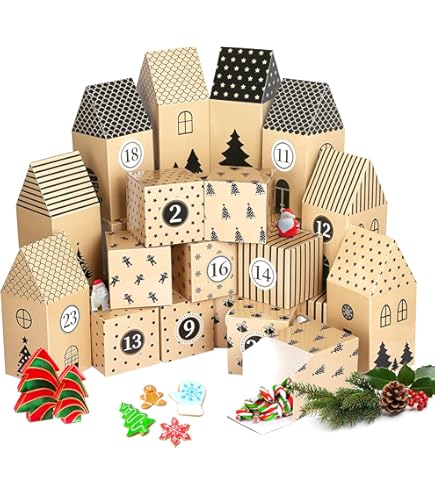 Gestalte deinen ganz persönlichen Adventskalender! Dieses tolle Set enthält 24 kleine Geschenkboxen aus Kraftpapier mit weihnachtlichen Motiven, Zahlenaufkleber von 1-24, Juteseil und Lichtband. Die Boxen sind bereits vorgefalzt und blitzschnell aufgebaut - keine Schere oder Kleber nötig! Einfach zusammenfalten, Aufkleber drauf, Geschenk rein und mit Schleife verschließen. Perfekt zum Aufhängen an der Wand, über dem Kamin oder am Weihnachtsbaum. Fülle die Boxen mit Süßigkeiten, kleinen Geschenken oder Weihnachtsschmuck und überrasche deine Liebsten täglich mit einer kleinen Freude. Ein wunderbares Bastelprojekt für die ganze Familie, das Jahr für Jahr wiederverwendet werden kann!