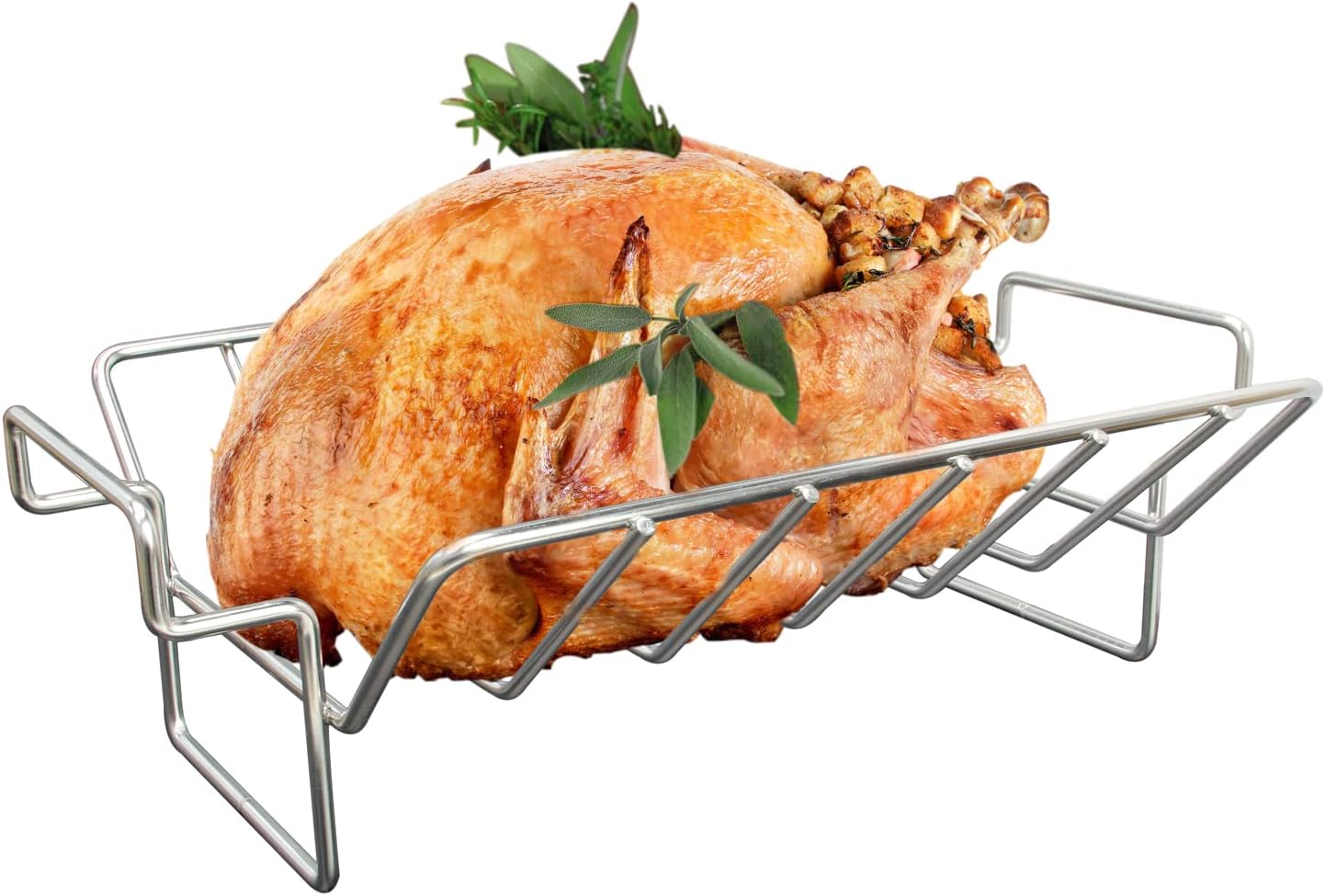 Ideal für Hühner von 1,8-2,3 kg, aber auch perfekt für kleine Truthähne, Enten oder Gänse. Sicher für Gas-, Holzkohlegrills und Backöfen.