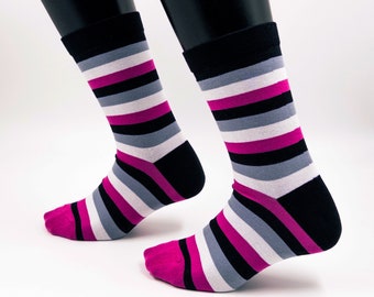 Zeig deine Farben mit diesen supercoolen Pride Socken! Das 3er-Set kommt in verschiedenen LGBTQ-Designs - inklusive Regenbogen, bisexuell, lesbisch, transgender, non-binary, asexuell, pansexuell und queer. Perfekt für alle, die stolz ihre Identität zeigen wollen! Die Sneaker-Socken sind nicht nur stylisch, sondern auch mega bequem. Aus hochwertigen Materialien mit angenehmem Tragegefühl - ideal für den Alltag, zum Sport oder einfach nur zum Relaxen. Es gibt zwei Größen: M (39-42) und L (43-46), also für fast jeden Fuß das Passende dabei. Das minimalistische Design ist farbenfroh ohne aufdringlich zu sein - genau richtig, um deinen Outfits einen bunten Akzent zu verleihen. Super als Geschenk für Freunde, zum CSD oder einfach für dich selbst. Waschmaschinenfest und langlebig - die Freude an den fröhlichen Designs hält also lange. Ob zu Sneakern, Boots oder einfach so - diese Socken machen immer eine gute Figur. Hol dir jetzt das komplette Set und wechsle je nach Laune durch die verschiedenen Pride-Flaggen!