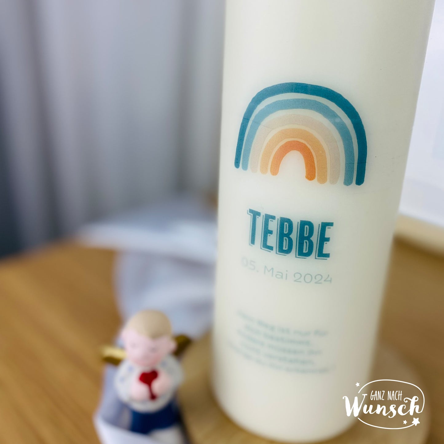 Ein ganz besonderes Andenken an besondere Tage! Diese personalisierte Stabkerze mit Regenbogen-Motiv wird mit Name und Datum eurer Wahl bedruckt. Perfekt für Taufe, Kommunion oder Konfirmation. Hergestellt in Deutschland mit hochwertigem UV-Direktdruck - keine billigen Aufkleber oder Folien! Die Kerze ist 40 cm hoch bei 4 cm Durchmesser und brennt ca. 45 Stunden. Aus Paraffin in klassischem Weiß. Wird in bruchsicherer Spezialverpackung geliefert. Ob als Altarkerze, als Symbol während der Zeremonie oder als Erinnerungsstück für zu Hause - diese Kerze begleitet die wichtigsten Momente. Ein Geschenk, das wirklich von Herzen kommt und noch Jahre später Freude bereitet. Bestellt noch heute und macht einen besonderen Tag noch unvergesslicher!