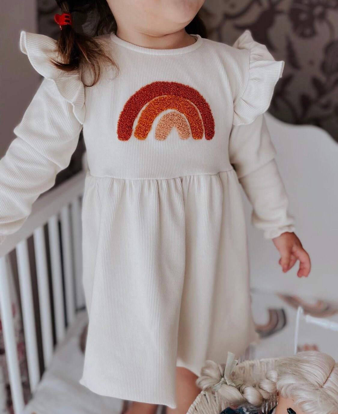 So süß! Dieses Regenbogen-Kleid lässt Mädchenherzen höher schlagen! Mit langen Ärmeln und kuscheligem Material ist es perfekt für den Winter. Der klassische Rundhalsausschnitt und der bunte Druck machen jedes Mädchen zum Star. Ideal für die Schule, Kindergeburtstage oder einfach so zum Spielen. Das hochwertige Material ist super weich auf der Haut und für Mädchen von 4-7 Jahren geeignet. Einfach zu kombinieren: Mit einer Sonnenbrille, hübschen Haargummis oder bunten Schuhen wird jedes Outfit perfekt. Pflegeleicht: Kann in der Maschine gewaschen werden (nur bitte nicht bleichen!). Ob für den Kindergarten, die Schule oder die nächste Feier - in diesem Kleid sieht deine Kleine einfach bezaubernd aus! Die perfekte Mischung aus Bequemlichkeit und Style - genau das, was Kinder lieben!