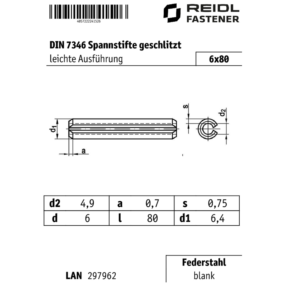 Reidl Spannstifte - 21x85mm DIN 7346 Stahl Blank 5 Stück