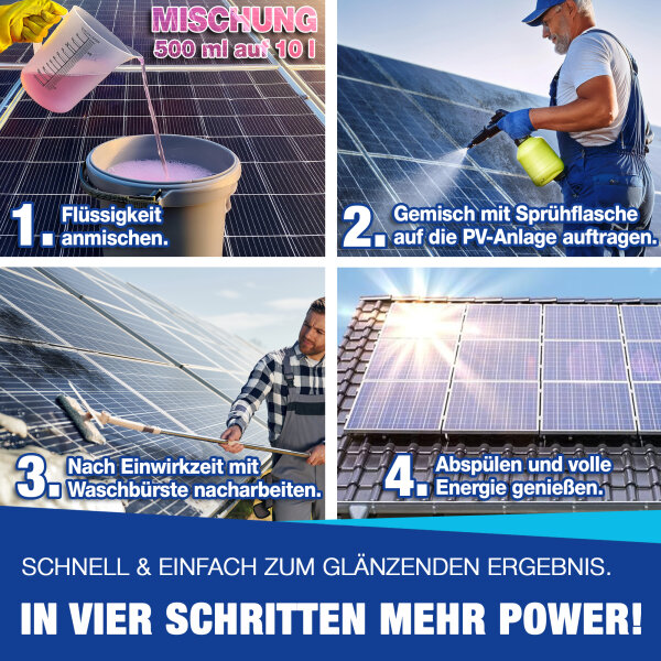 Deine Solaranlage verdient die beste Pflege! Dieser Spezialreiniger von Axis Line (Made in Germany) entfernt schonend Verschmutzungen und lässt deine Module wieder strahlen. 5 Liter Konzentrat reichen für viele Reinigungen. Wichtig: Immer bei Morgentau reinigen, nie bei praller Sonne! Am besten mit Regen- oder destilliertem Wasser mischen, damit keine Kalkflecken entstehen. Perfekt kombinierbar mit den Teleskopstangen und Bürsten von Axis Line - einfach im Shop stöbern. Ob für private Anlagen oder gewerbliche Nutzung - dieses Profi-Reinigungsmittel hält, was es verspricht. Übrigens: Axis Line bietet alles aus einer Hand - Reinigungsmittel, Stangen, Zubehör - alles passt zusammen und kommt in einem Paket!