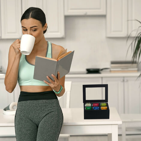 Relaxdays Teebox 6 Fächer Transparent - Teebeutel Aufbewahrung 21,5x15x9cm